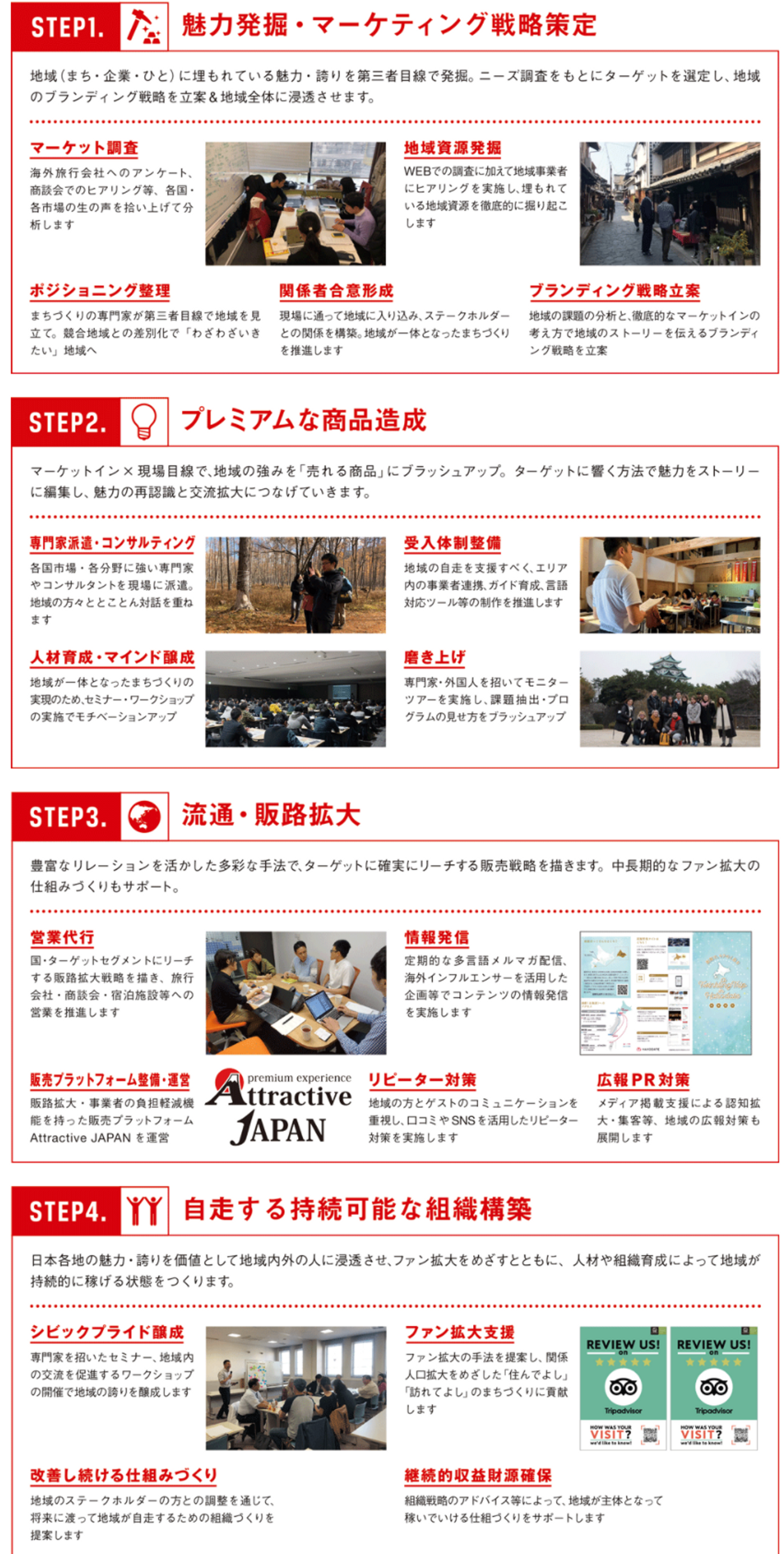 自社で運営する「Attractive JAPAN」他、Bookingプラットフォームの登録サポ―トでの海外旅行客への販路拡大、受入体制のコンサルティング、観光客受入整備(パンフレット制作やWEB制作など)、海外旅行会社営業の体験プログラムの販路拡大営業、外国人専門家派遣など様々です。