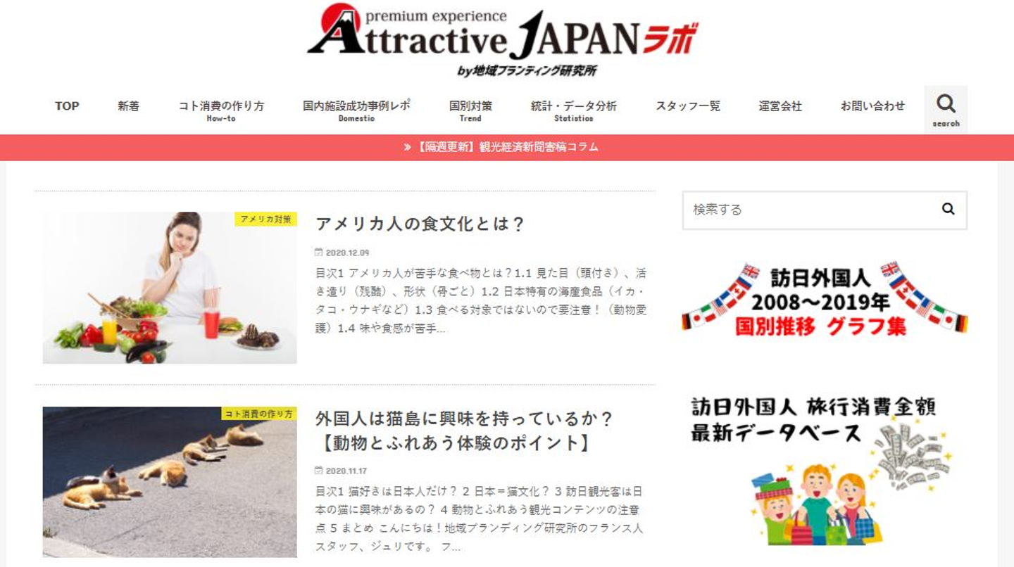 また、インバウンドの最新トレンドや訪日観光客誘致ノウハウ凝縮メディア「Attractive JAPANラボ」の運営も行っています。欧米など、外国人スタッフ目線の観光で気を付けるべきポイントや流行についてのコラム、観光トレンドやインバウンド関連の分析レポートなどを発信。スタッフがライティングしています。