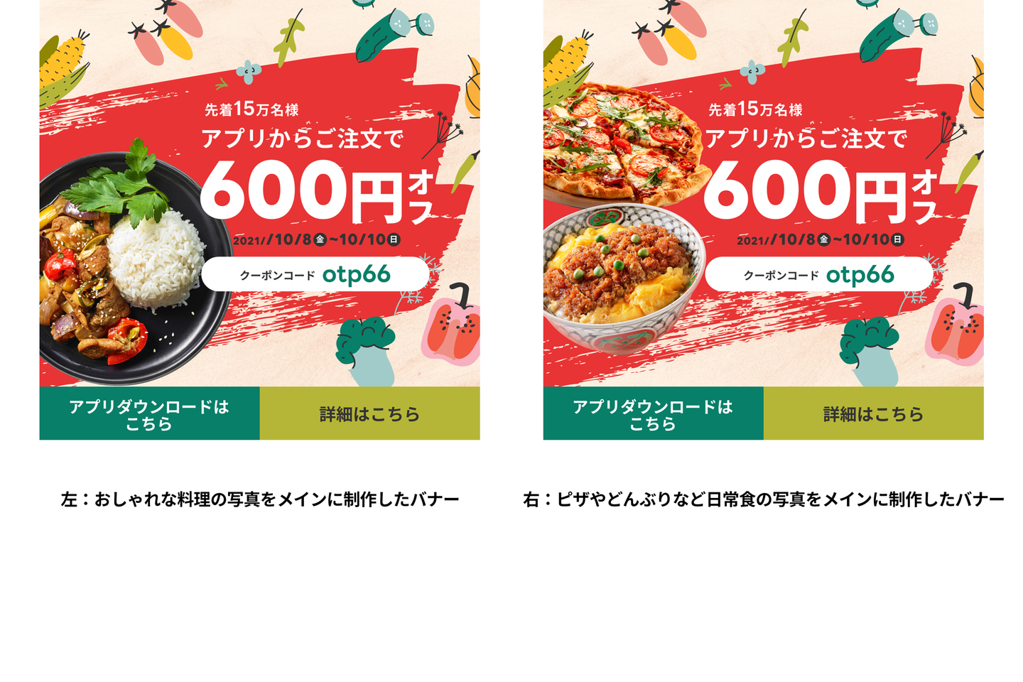 山口:以前制作したバナーのABテストを実施したことがあります。ひとつは少しおしゃれな料理の写真をメインにしたもの。もうひとつはピザとか丼とか日常食、同じデザインで料理の写真だけ変えたものでした。通常は1パターンの制作のところ、2パターン制作するので少し大変でした。