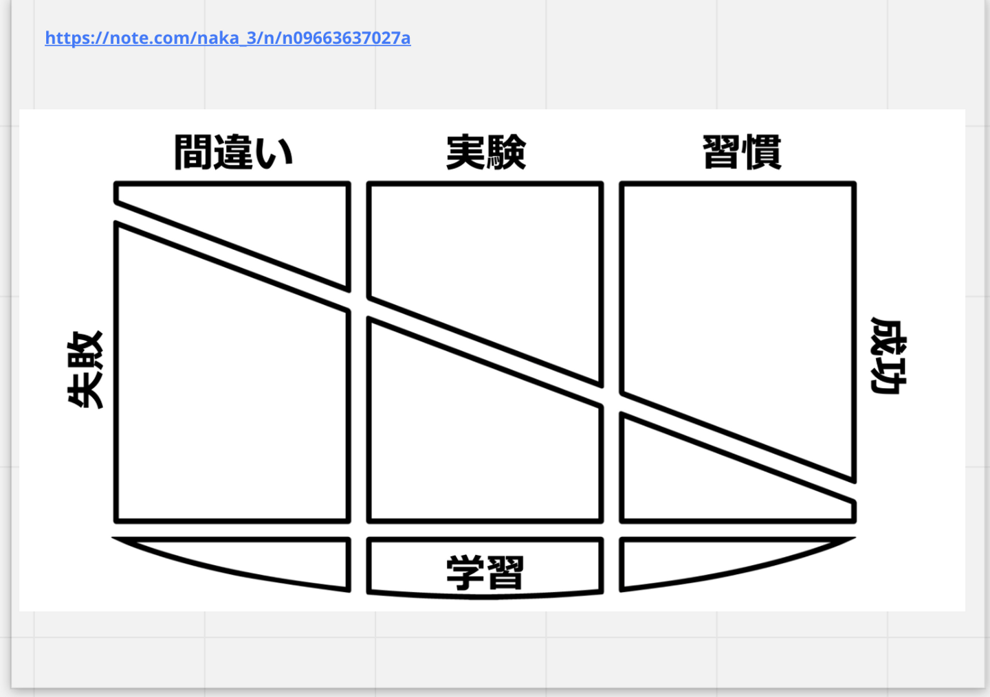 セレブレーショングリットというフレームワークを活用して、週の振り返りをしています。オンラインホワイトボードツール「miro」を使っており、縦軸に成功/失敗、横軸に間違い(失敗)/実験/習慣と記載されたボックスがあり、そこに今週自分がしたことを配置していきます。