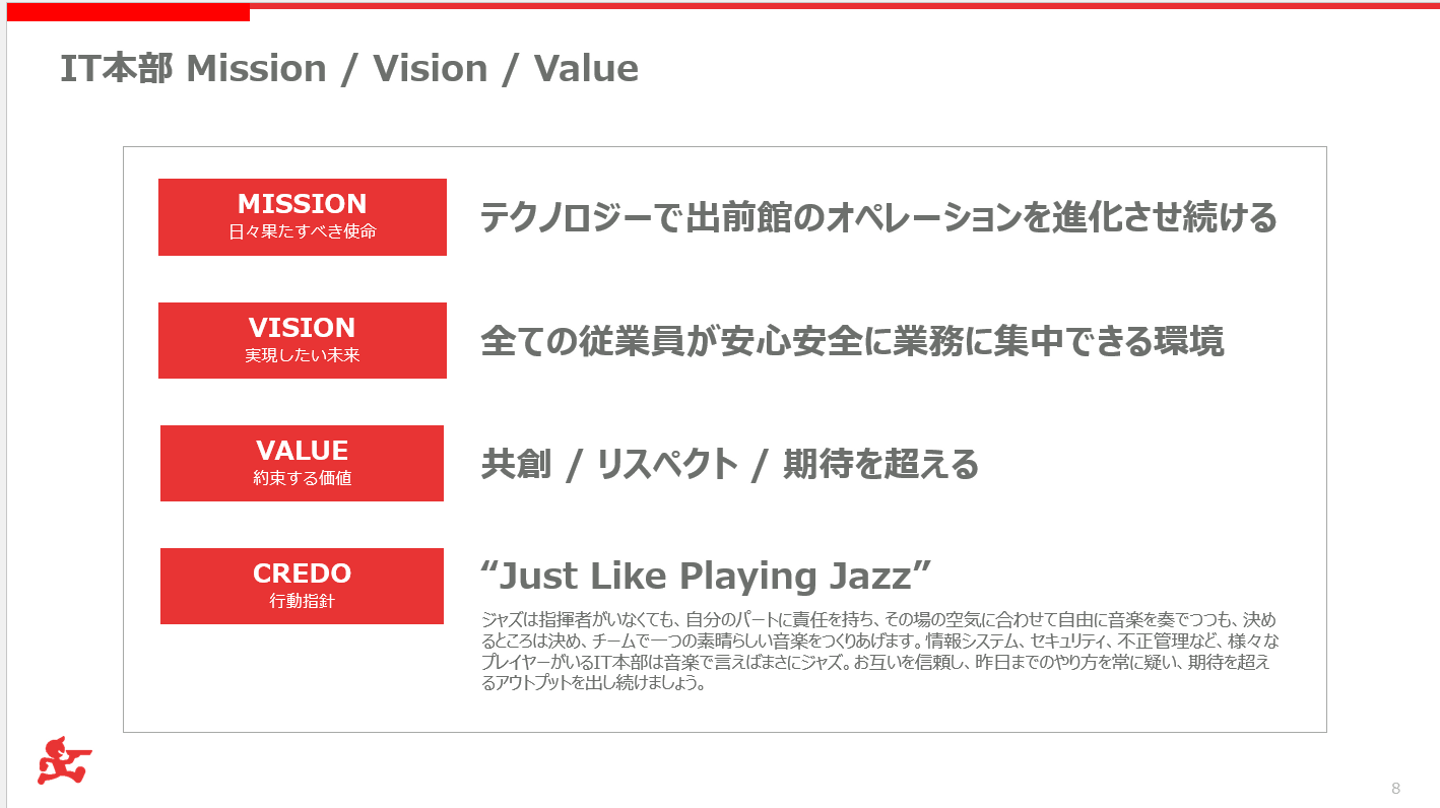 IT本部には、上の資料のようなMission・Vision・Value・Credoがあります。これは、先ほど名前を挙げた米山が作成したものです。これらの要素を持ち合わせていてほしいのですが、特にCredoの「Just Like Playing Jazz」はIT本部らしいフレーズだと思います。ジャズという音楽では、指揮者がいなくても各々のプレイヤーが自分のパートに責任を持ち、その場の空気に合わせて自由に音楽を奏でます。そして、決めるところは決めながら、チームで一つの素晴らしい音楽を作り上げます。