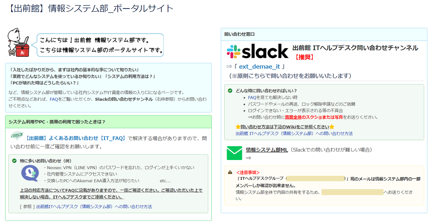 また、情報システム部では社内のメンバーがアクセスできるポータルサイトを運営しています。私はある程度の要望は出しましたが、コンテンツのほとんどは派遣社員の方々が自ら内容を考え、自主的に作成してくれました。たとえば入社オンボーディングのページを見てみると、パソコンのセットアップ方法やアカウントの設定方法などが図とともにわかりやすく解説されています。