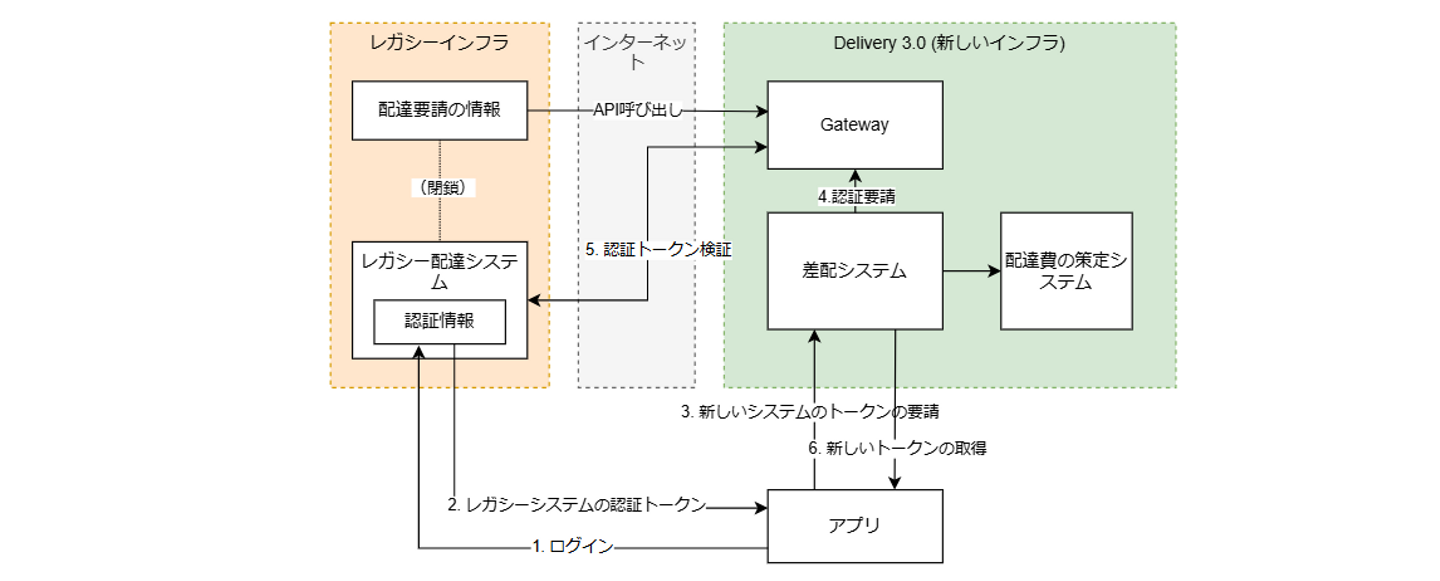 出前館では、2022年にDeliveryのドメイン全体をインフラから他のドメインと切り離す作業を行いました。Delivery3.0というプロジェクトで、下図はDelivery 3.0移行時の2つのシステム間の認証フローを簡単に表したものです。システムを入れ替えても全員がログアウトされることなく、認証を維持したまま作業を進めたいため、アプリではレガシーシステムにログインした後、新しいシステムのトークンを再発行するフローを作りました。