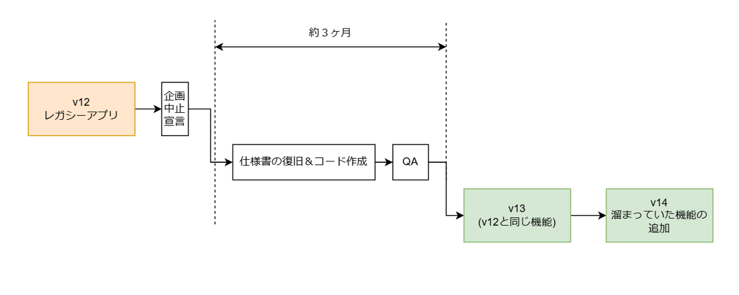 下の図はRecodeプロジェクトを進める時、企画から開発までのスケジュールを大まかに示した図です。新しい企画を一旦中断することを宣言した後、約3ヶ月間現在の仕様通りにコードを新しく作成します。QAも1ヶ月またはそれ以上かかることもあります。