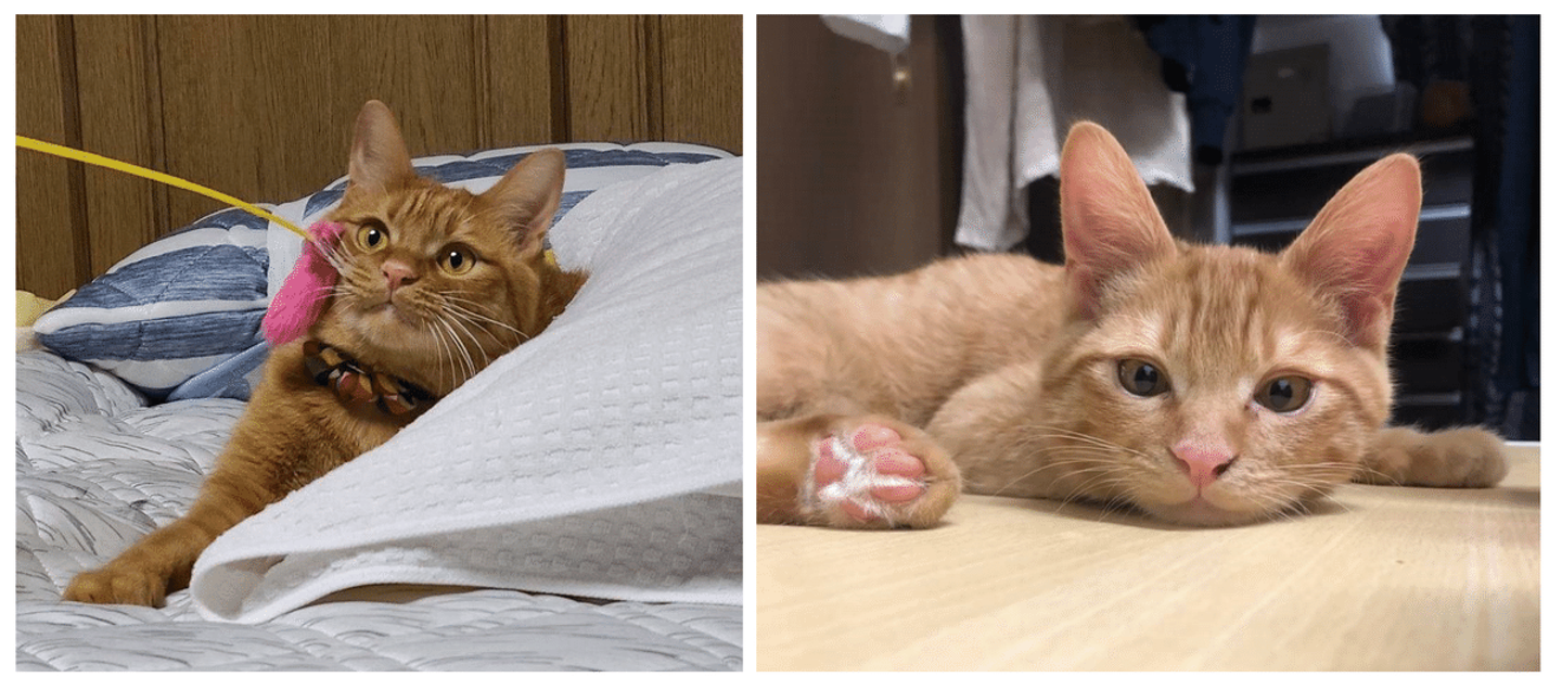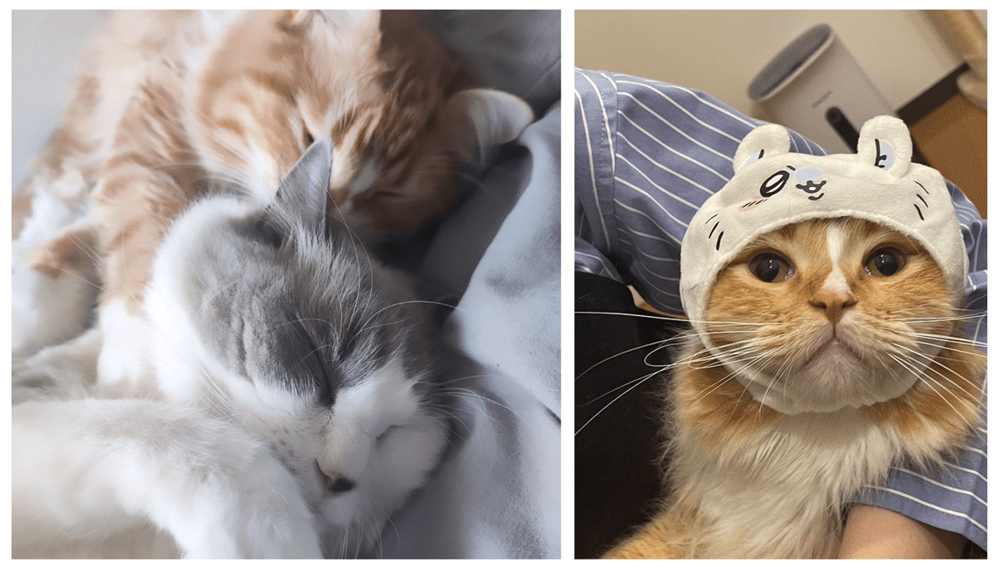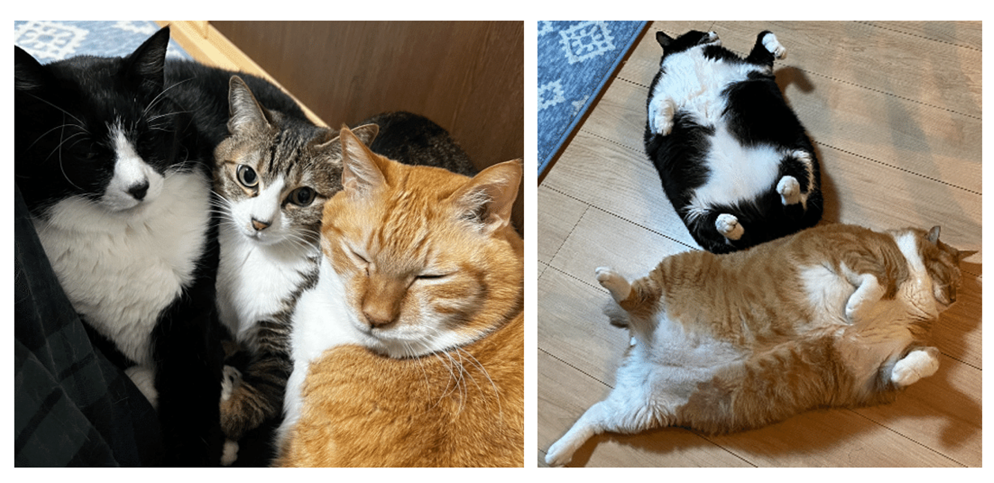 2匹とも保護猫ちゃんです。どちらも甘えん坊で、抱っこしろ、遊べ、ケツを叩け、の意思表明で常にニャンニャン泣き喚いています(笑)明け方でもお構いなく起こされますが、満足そうな顔で眠りに落ちていくのを見ていると疲れが吹っ飛ぶほど癒されます(寝不足にはなります)