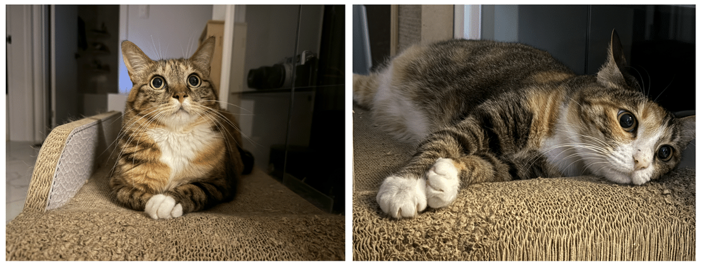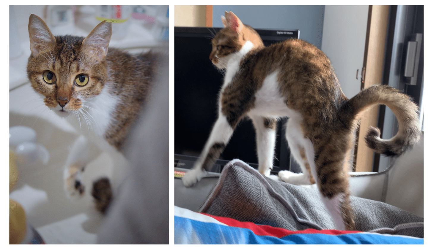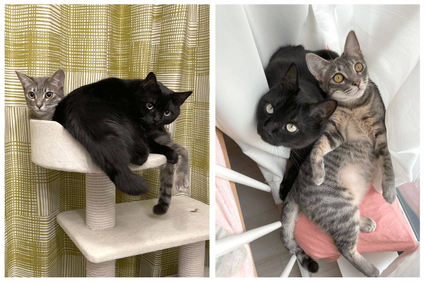 2匹とも保護猫ちゃんです。どちらも甘えん坊で、抱っこしろ、遊べ、ケツを叩け、の意思表明で常にニャンニャン泣き喚いています(笑)明け方でもお構いなく起こされますが、満足そうな顔で眠りに落ちていくのを見ていると疲れが吹っ飛ぶほど癒されます(寝不足にはなります)