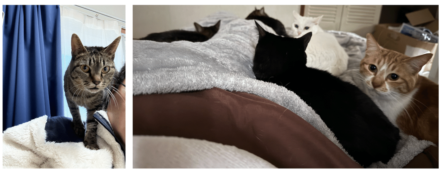5匹(4女1男)の保護猫とくらしています。肩に乗っているのはぺこさんです。甘えん坊の自由な末っ子です。2枚目は布団の上に全員集合して豊田を金縛りに合わせていた際の写真です。こうなると布団の中で完全に身動きが取れません。