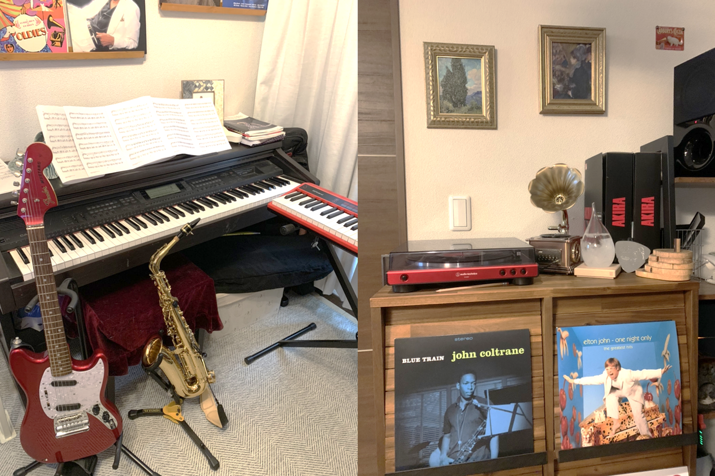 写真:リモートワーク用に徹底的にこだわった自宅のデスクと趣味の楽器や音楽グッズ。ヲタクっぷりが自宅の様子からも伝わってきます...