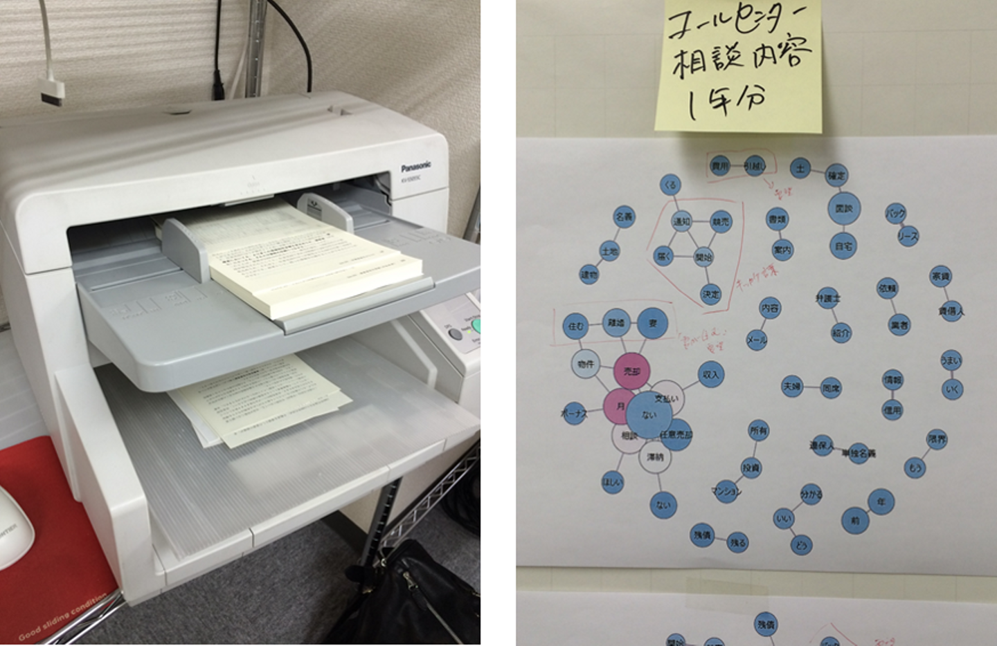 (写真:2014年1月頃、ミエルカ開発の初期で基礎研究時の様子。コールセンターの受電内容や本を裁断してスキャンし、OCRにて語の共起関係を測定、膨大なWebページを読み込んで研究。毎週土日はすべてこれに費やしていましたが、生きる糧を得ていました。)
