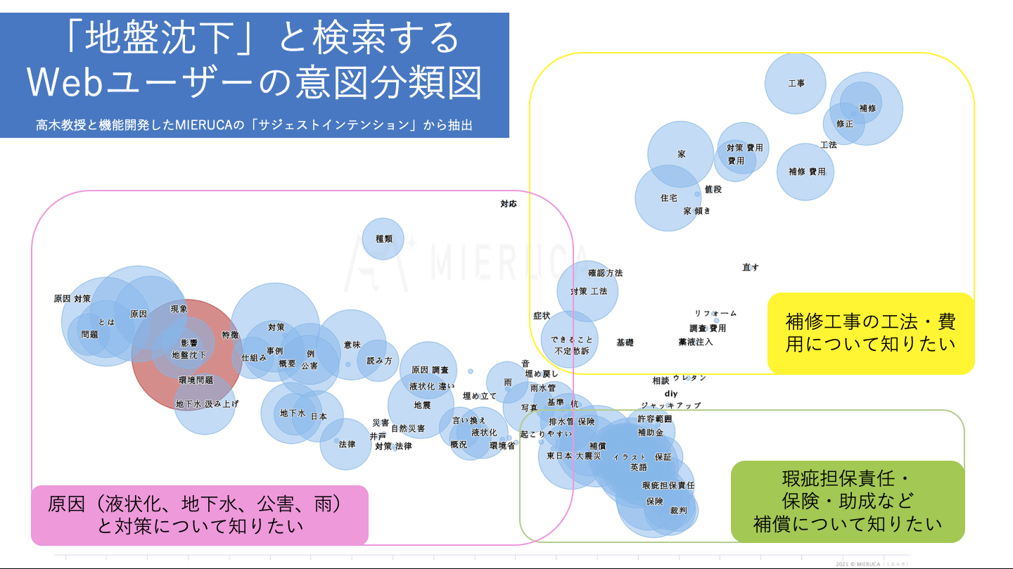 副島:この時に例題で出たキーワードは「地盤沈下」でした。このキーワードにまだたどり着いていないユーザーは「家 傾く」「埋め立て」「液状化」などのキーワードを調べることが多いのですが、これが「共起」ですね。「Web上のデータをクローリングして解析すれば、“似た意図”の言葉を近くにまとめる機能ができそうだ」とあたりをつけることができました。
