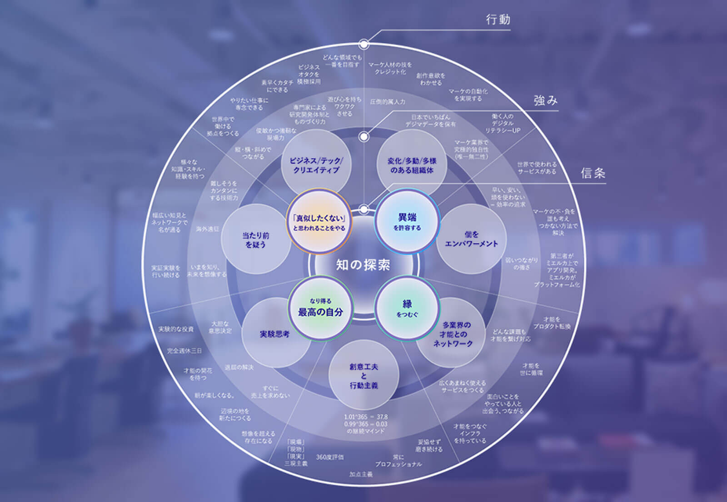 ※マンダラ模様のようなマス目一つ一つに、会社として大切にしたい信条や価値観を表現している