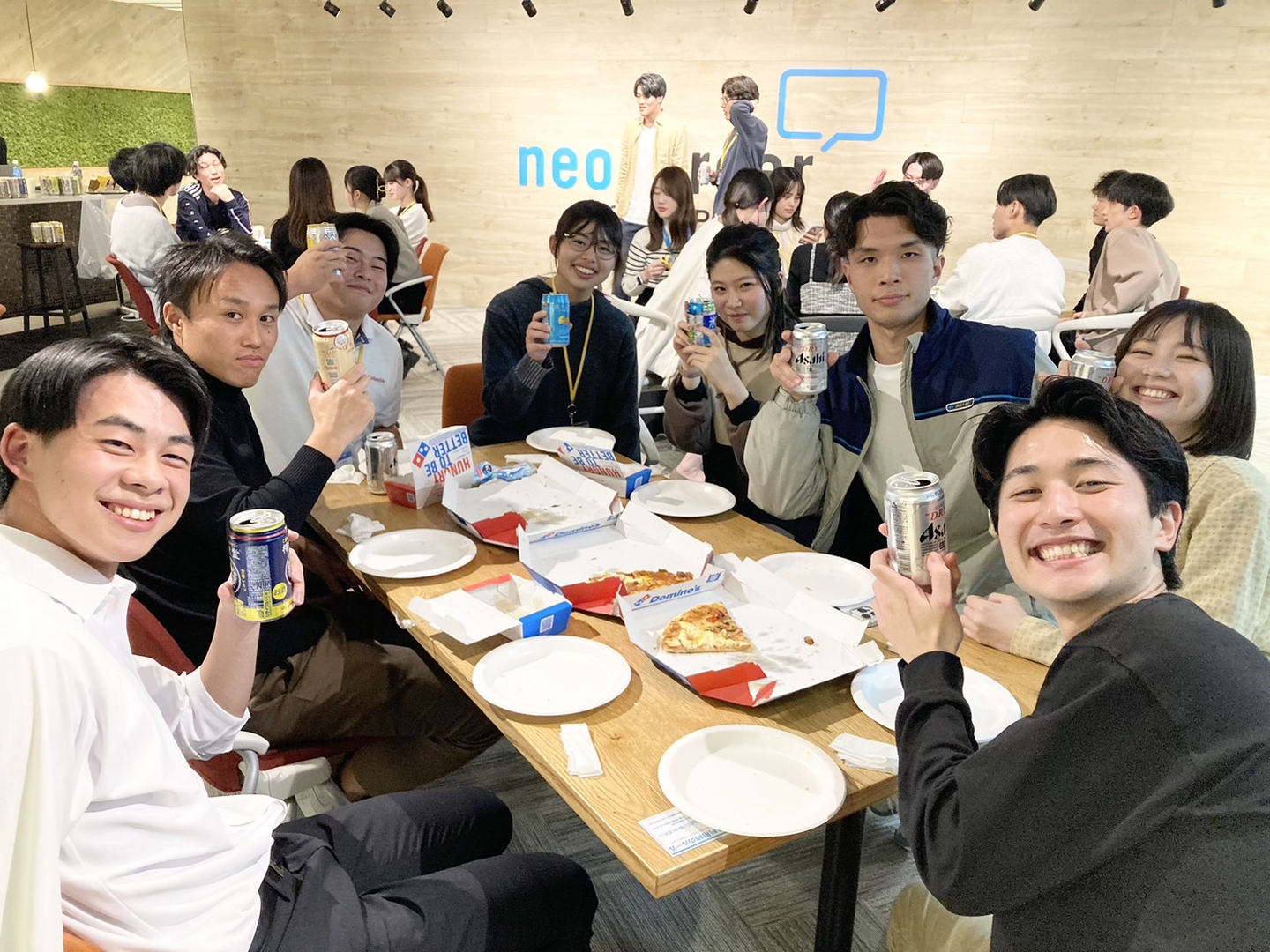 ピザやお酒を囲みながら、チームの仲間と楽しい時間を過ごしました。