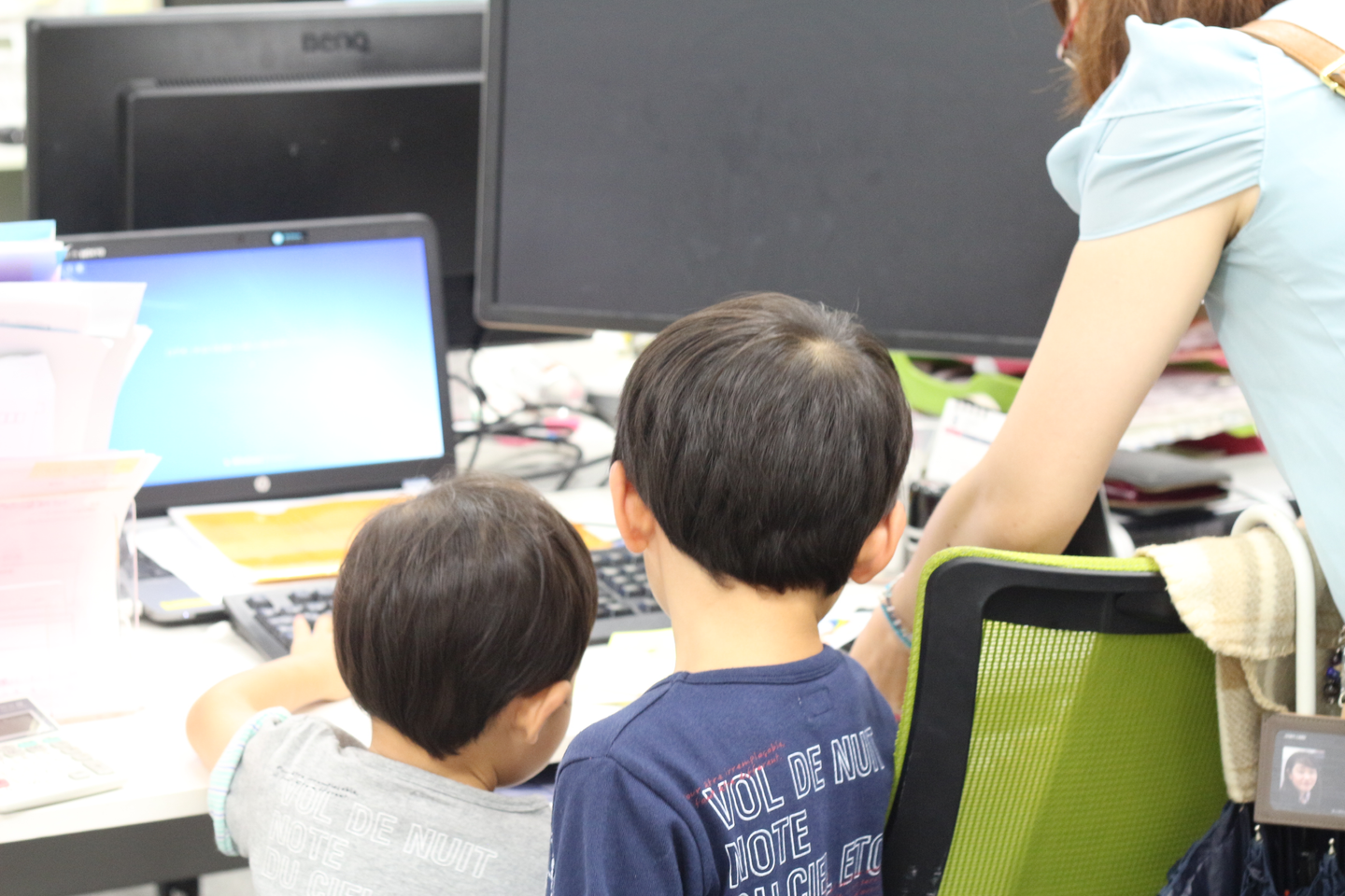 日ごろパパ・ママが働いているデスクに座ってもらいました。デスクの上に置かれたもの、そして「どんな人と働いているのか」に興味津々です。