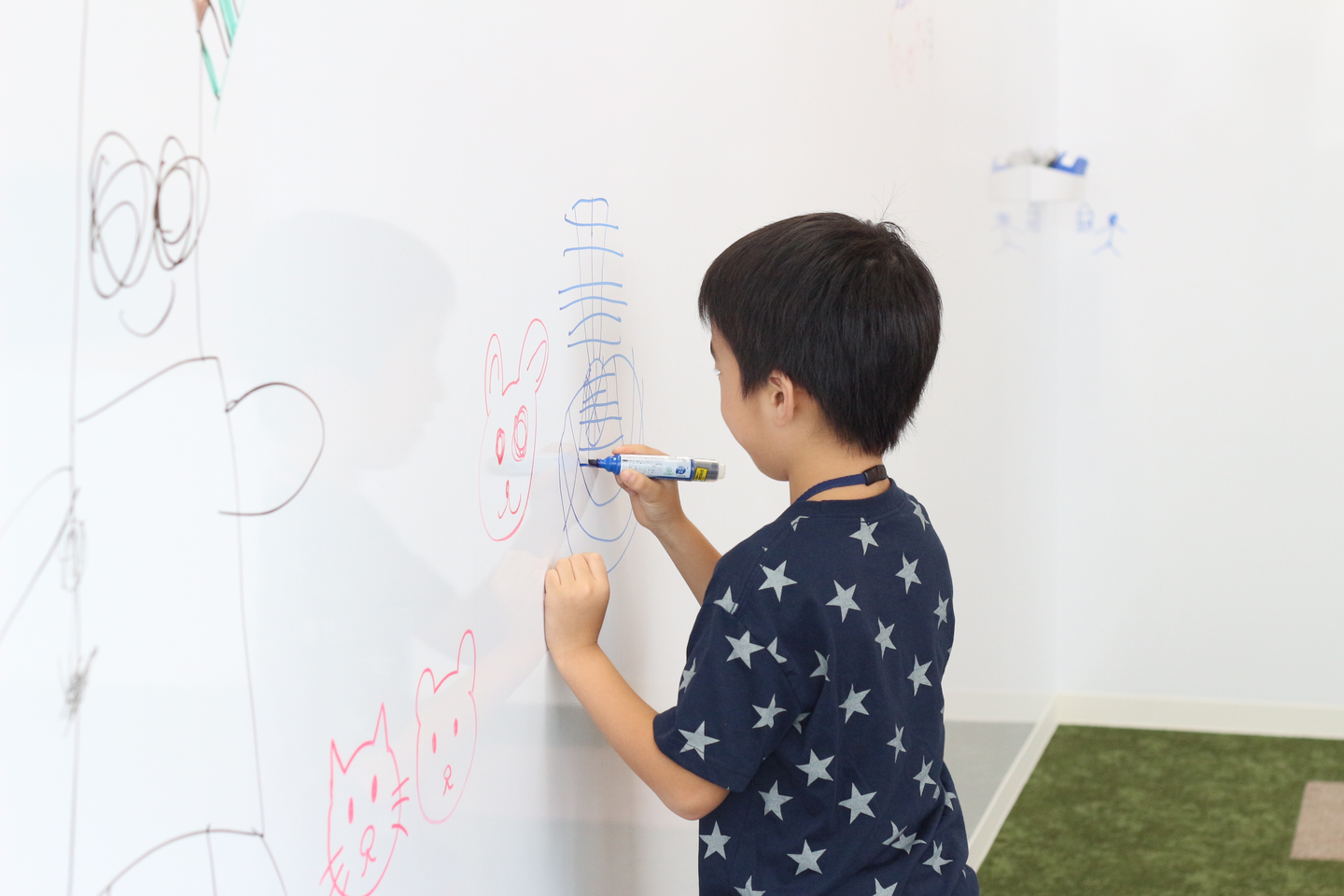 壁全面がホワイトボードのお部屋「CARREL」で「今日の思い出」をお絵かきしました。日ごろディスカッションやアジャイル開発に使われているホワイトボードですが、今日はPepperやパパ・ママの絵が壁を彩りました。