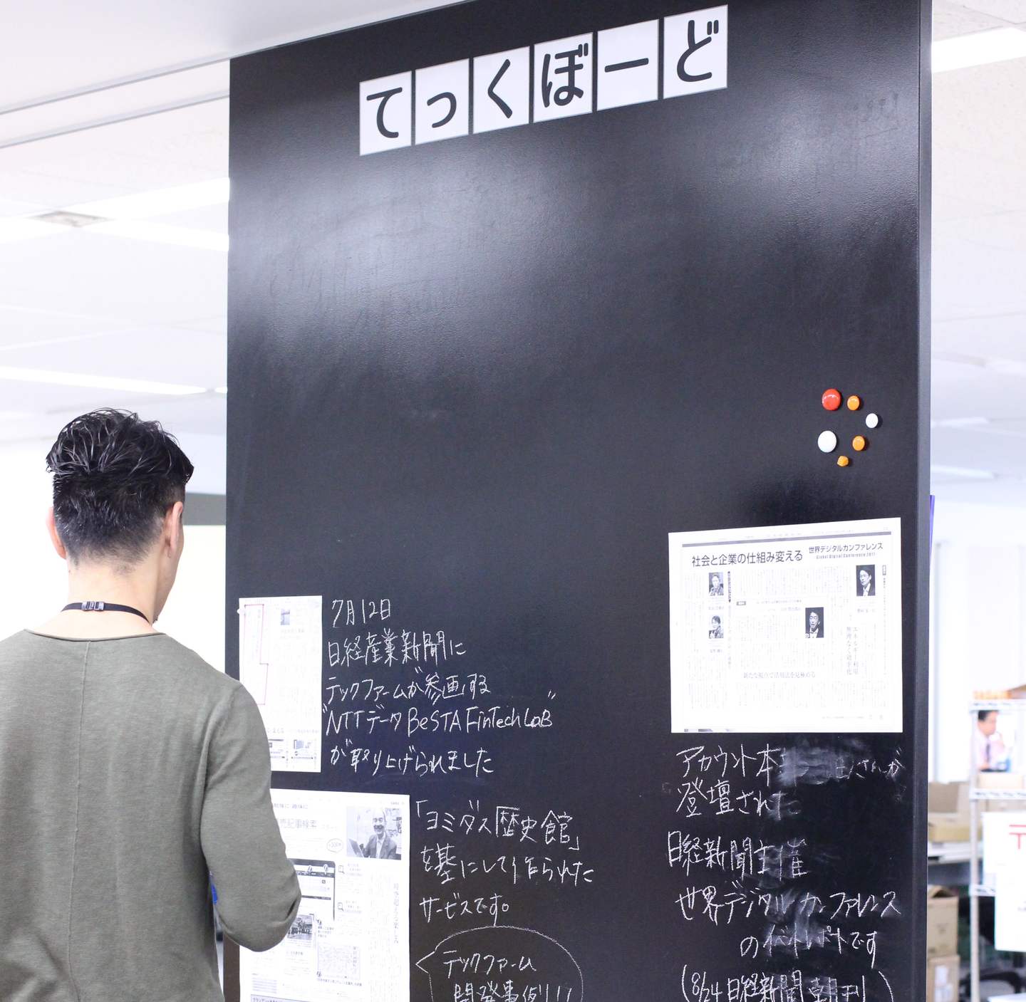 テックファームのフロアには、自販機の前に「てっくぼーど」という、新聞や雑誌に取り上げられた記事を紹介するコーナーがあるのですが、意外と買ったドリンクを飲みながら眺めている人が多いんです。