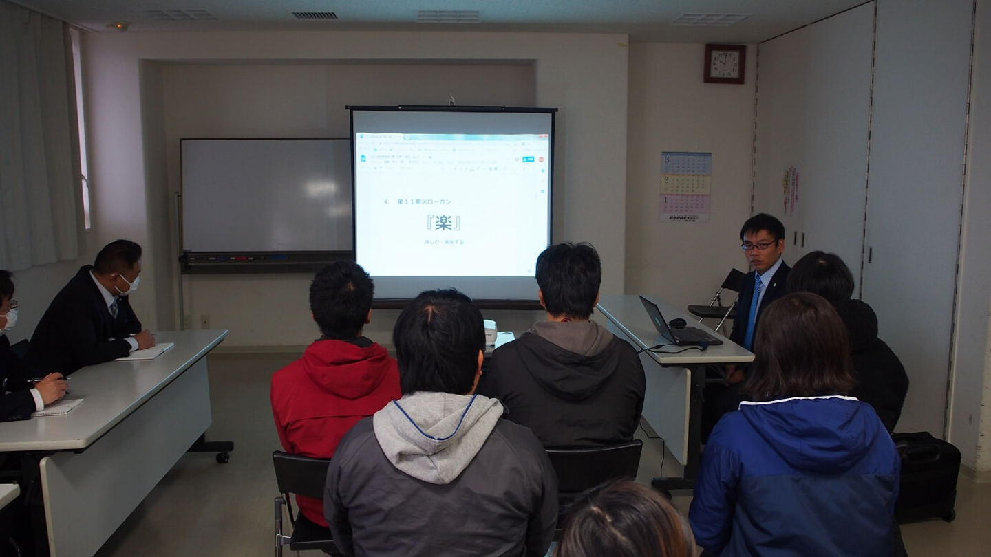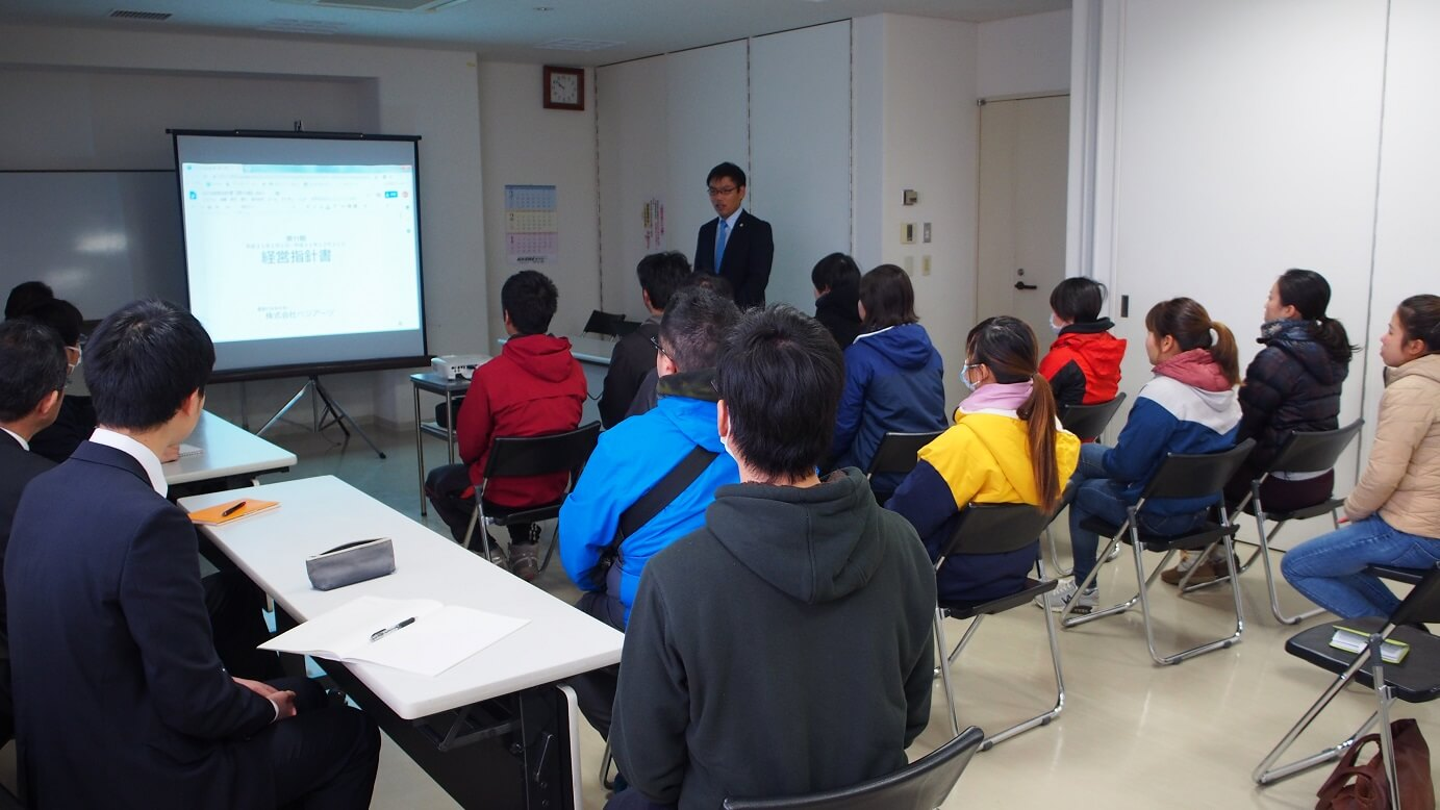 売り上げ目標や、社名の秘話、今期のスローガンなど盛り沢山の内容でした。