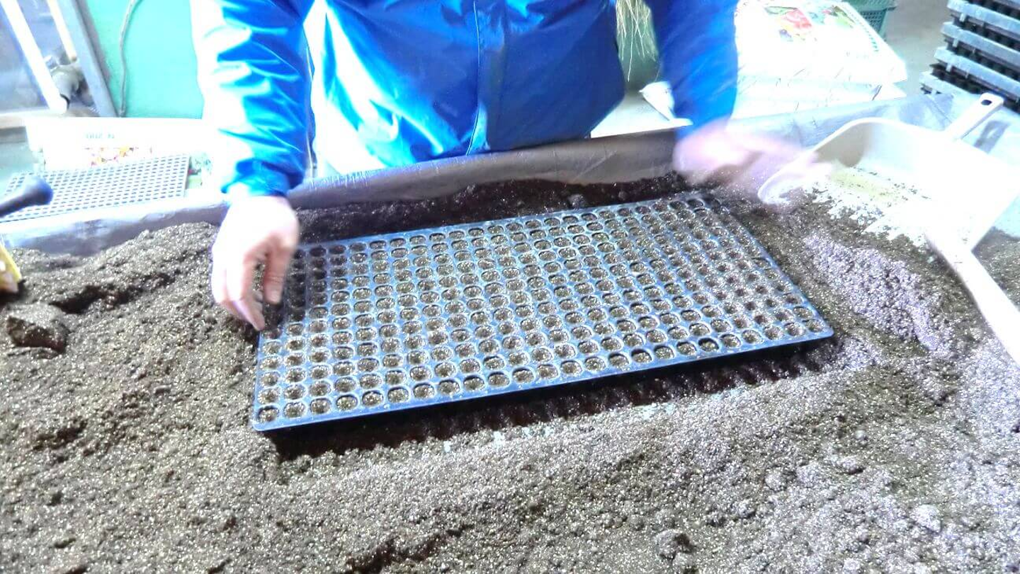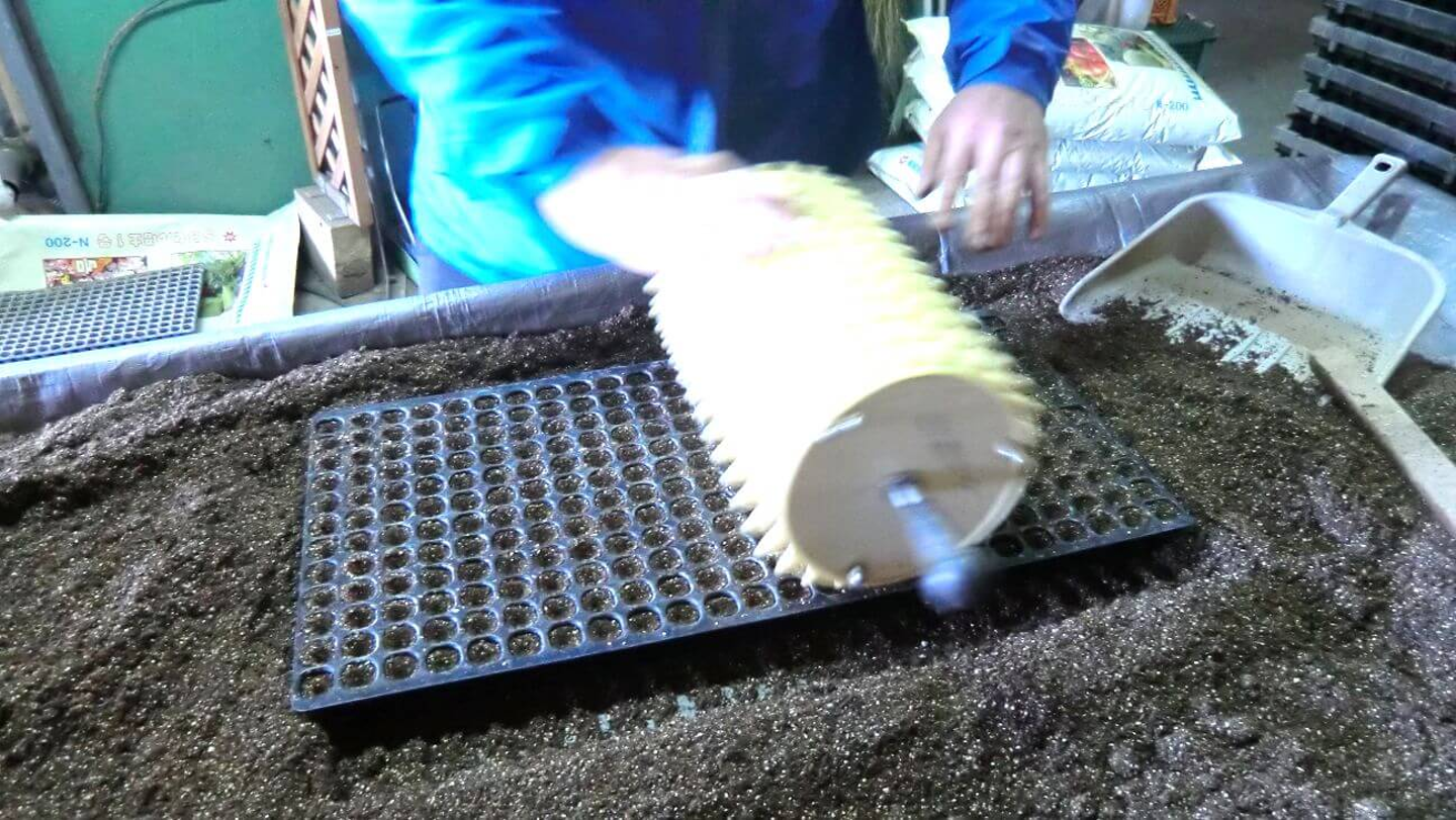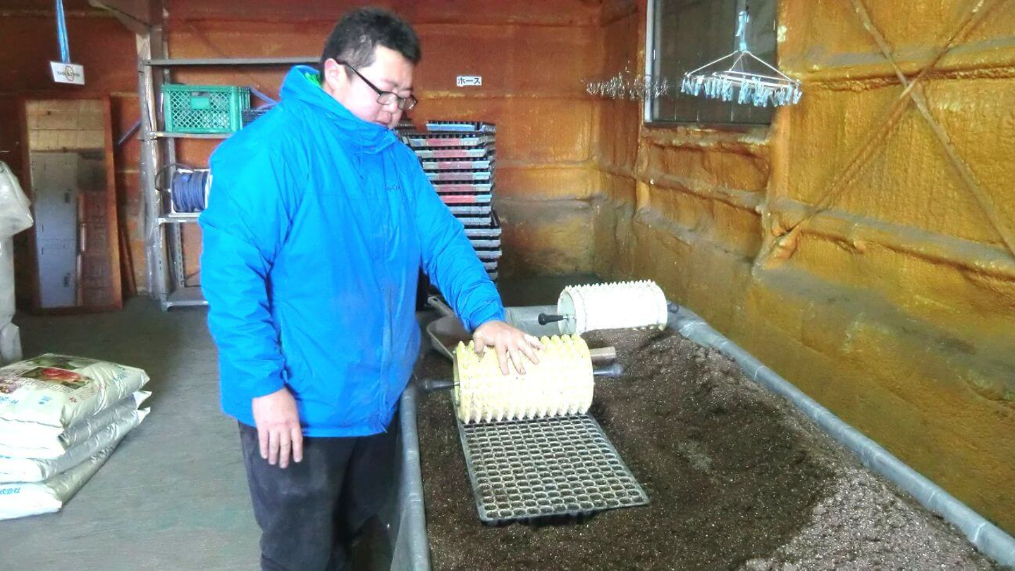 種苗班農場長 俵山が、ポットに土を入れて種まきの準備を進めています。