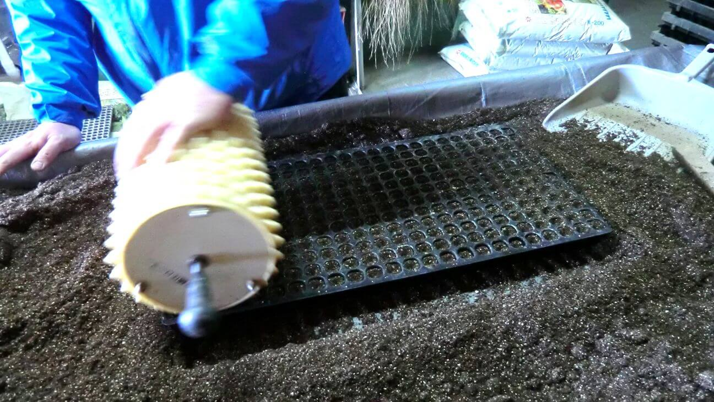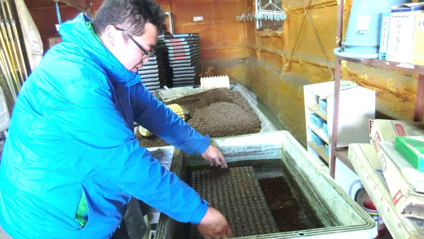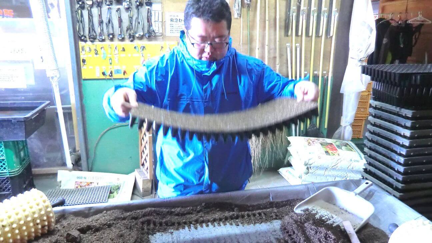 種苗班農場長 俵山が、ポットに土を入れて種まきの準備を進めています。