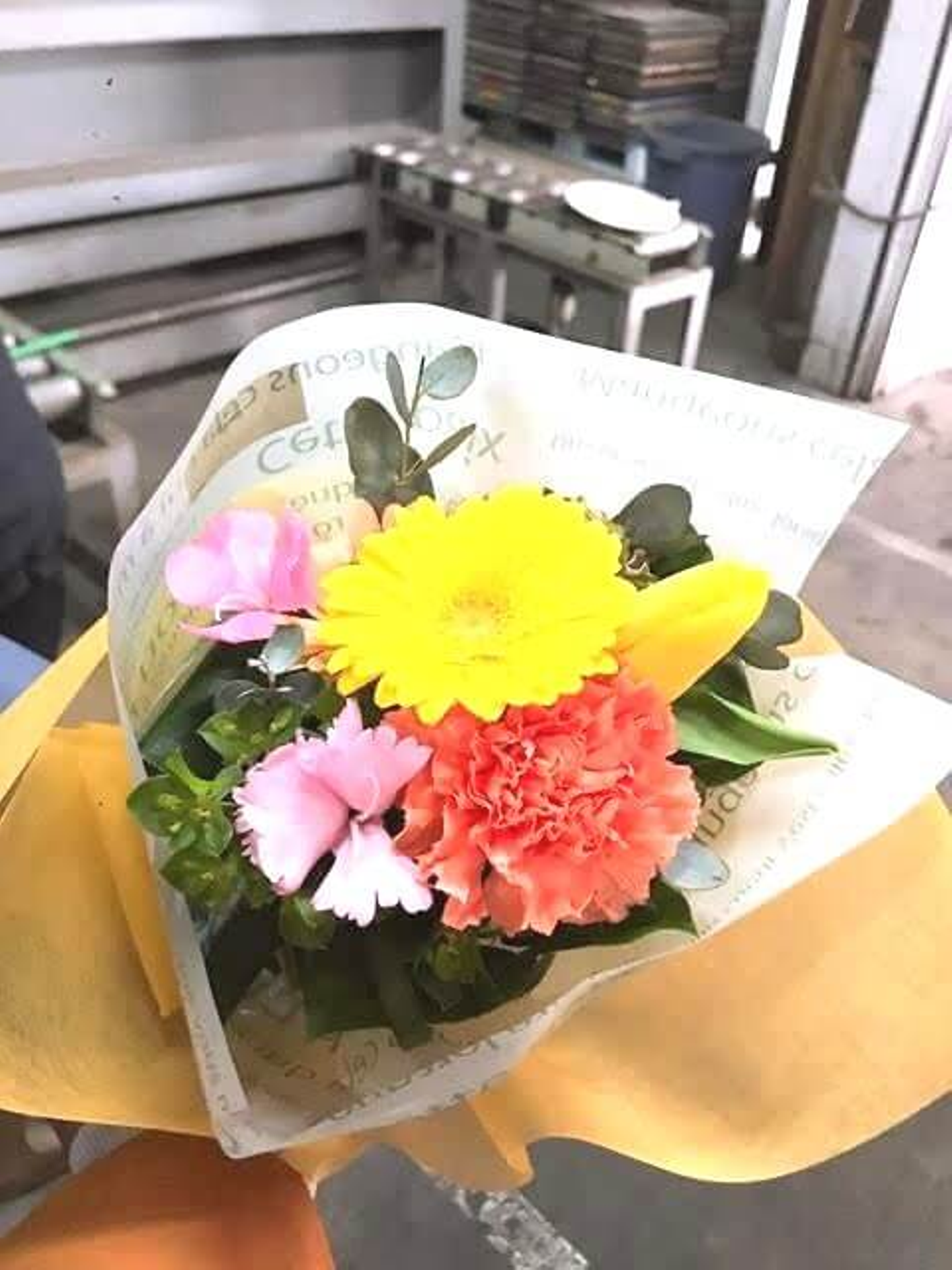 可愛らしいブーケを持ったフォンさんとハンさんが、ケーキの登場に驚いているところです。