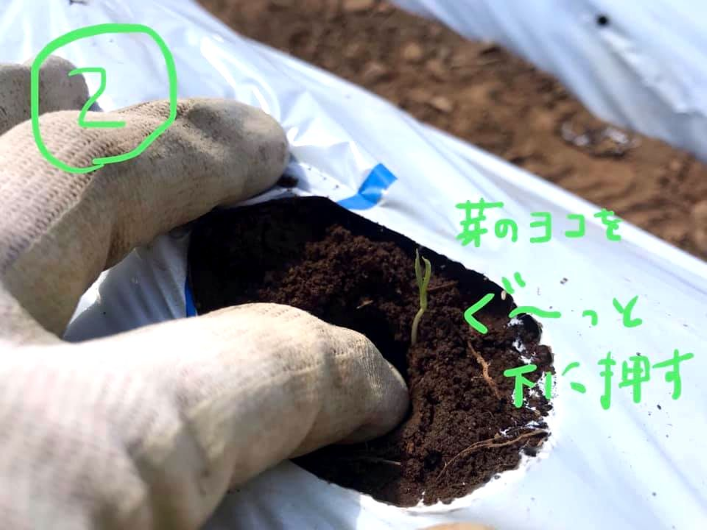 芽の横辺りに指をあてて、芽も一緒に優しくグーッと土を下に押し込みます。