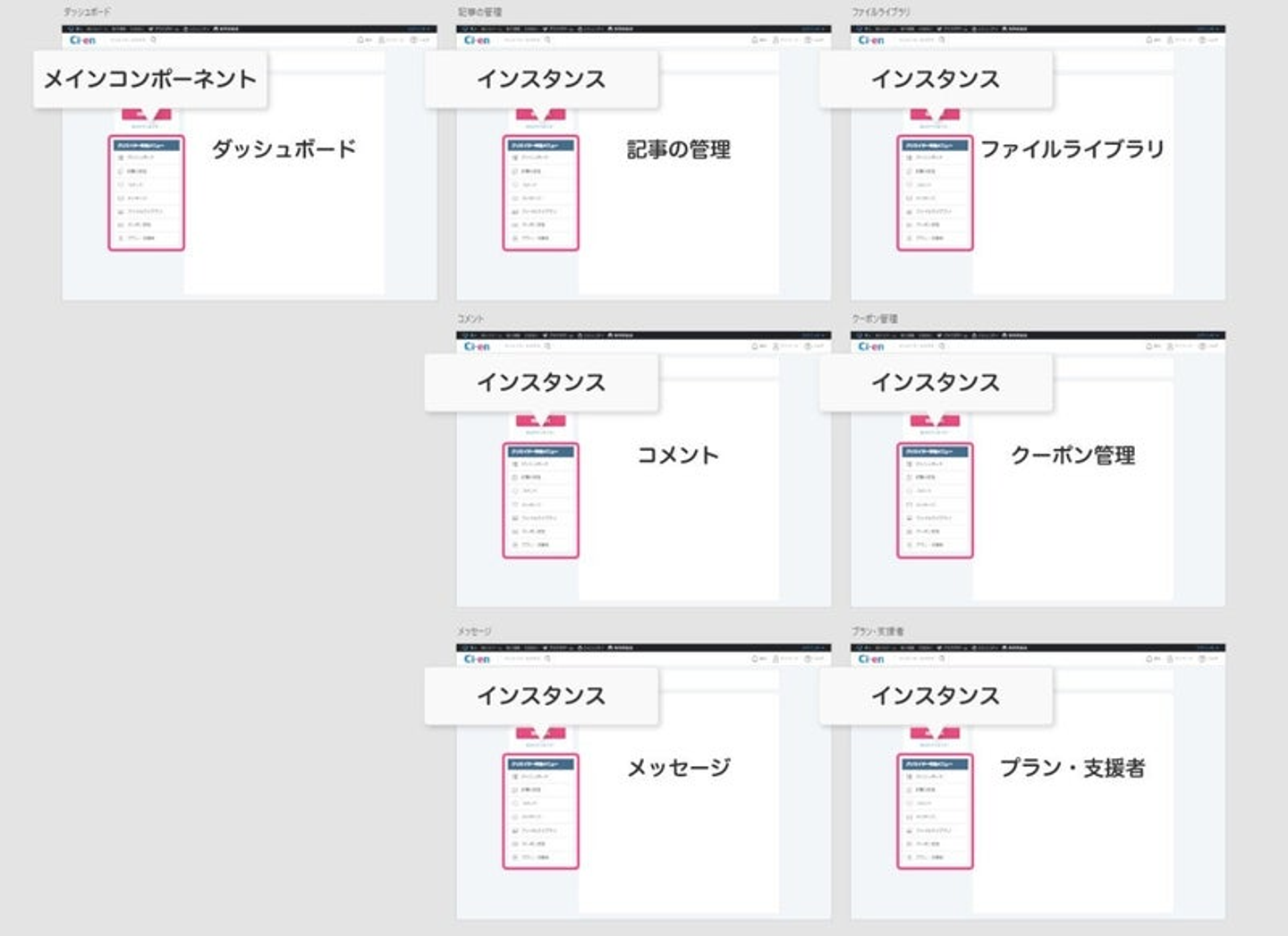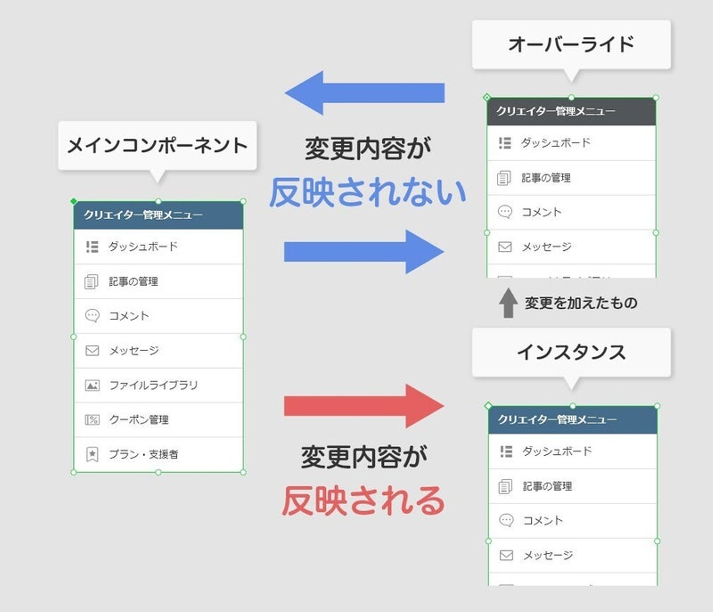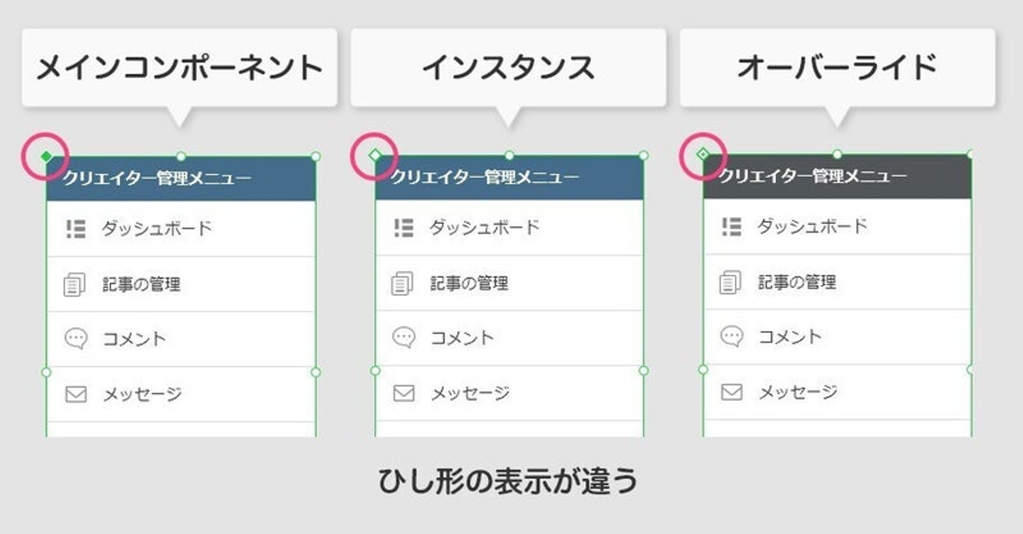 登録した大元のコンポーネントをメインコンポーネント、それを使いまわしたりコピーしたりしたものをインスタンスと呼びます。そしてインスタンスのプロパティを個別に編集したものをオーバーライド(上書き)といいます。ややこしいですね。