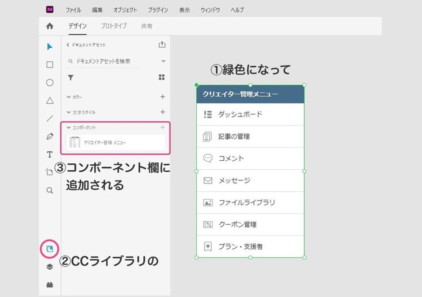 選択したオブジェクトがコンポーネント化されます。コンポーネント欄に追加されたコンポーネントはボード上にドラッグ&ドロップで呼び出すことができます。