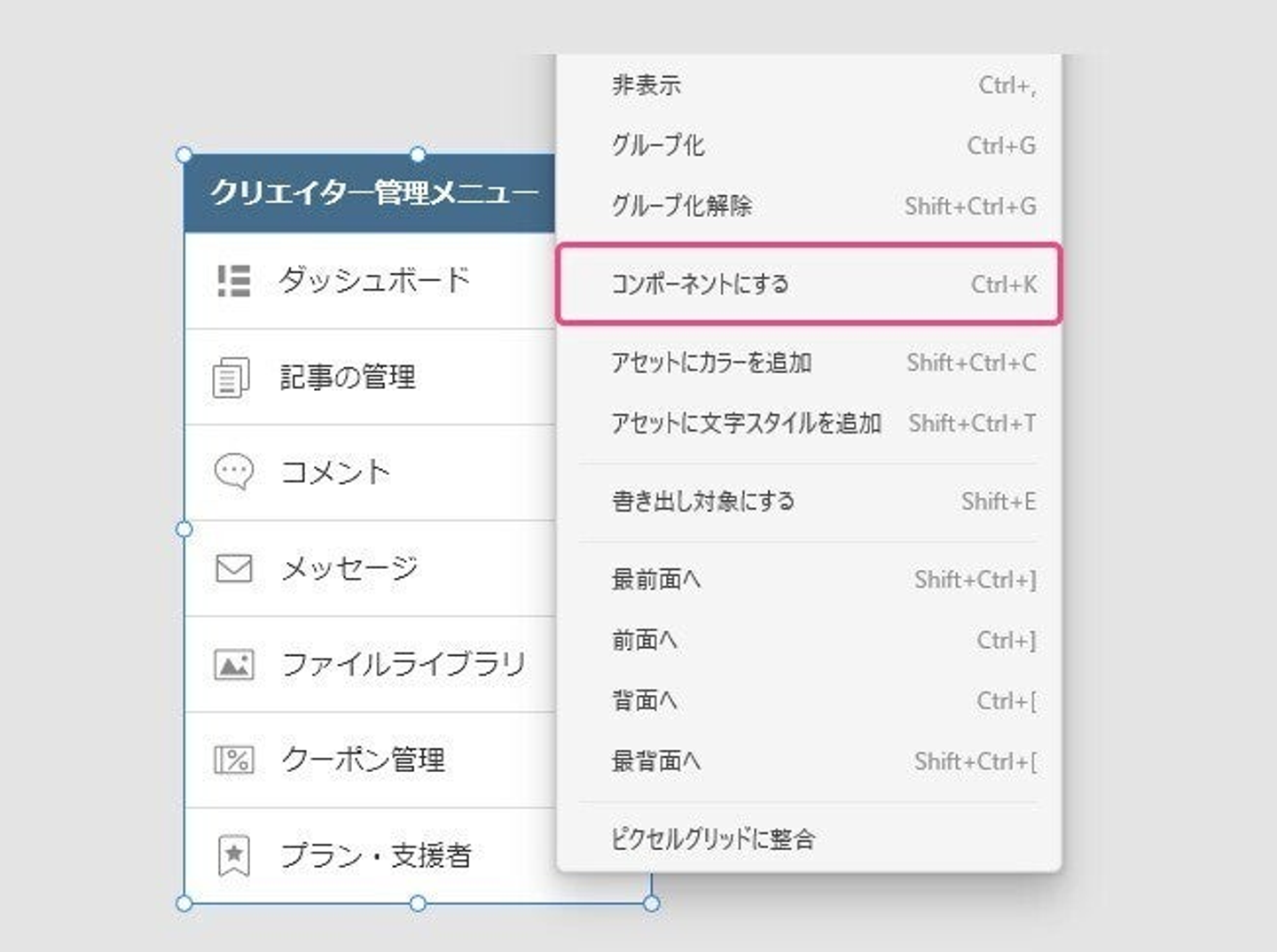 オブジェクトを選択して右クリック、「コンポーネントにする」を選択すると