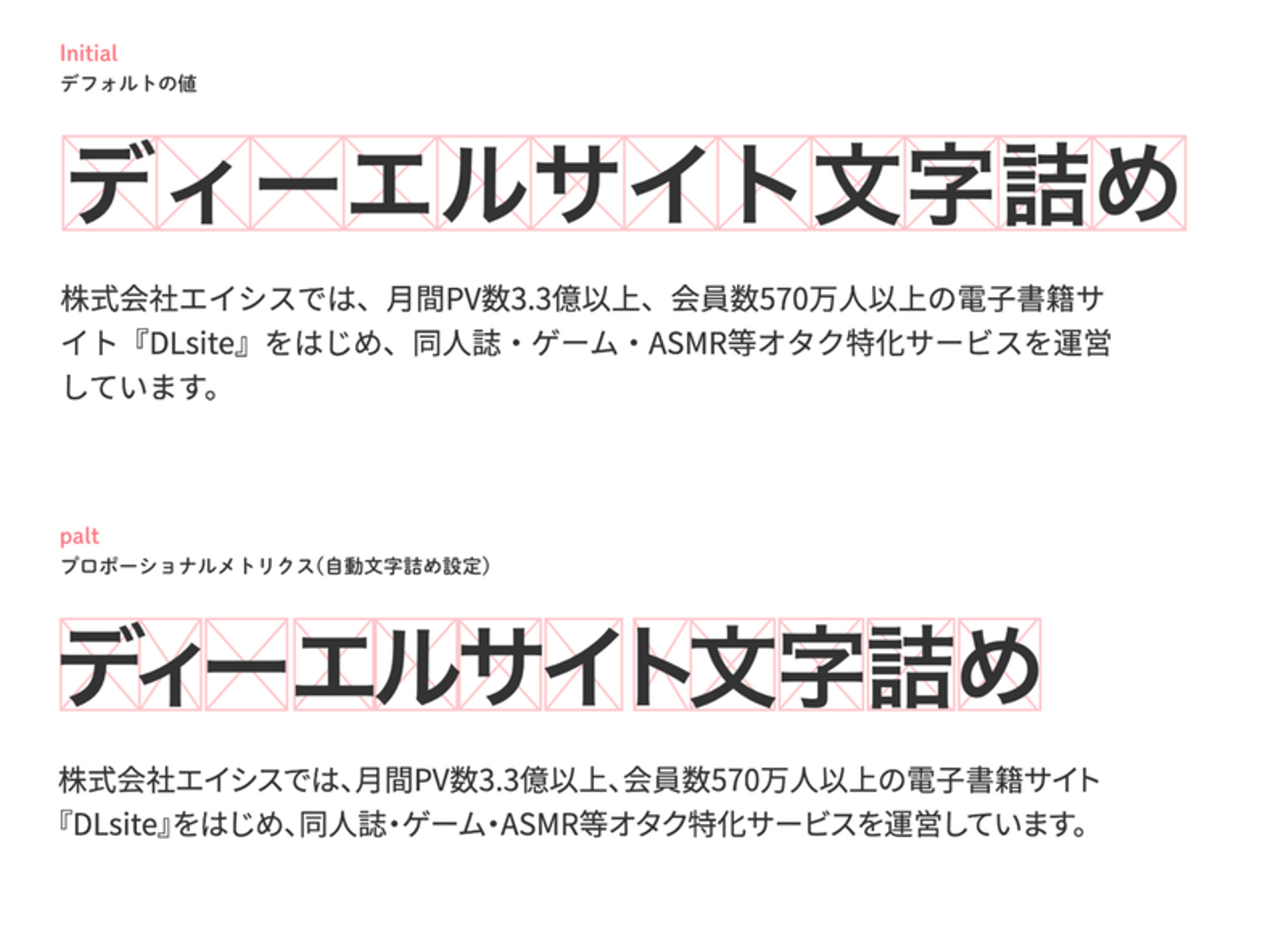 font-feature-settings: "palt";デフォルトの値が"initial"、プロポーショナルメトリクスでの自動文字詰め設定が"palt"の値になります。