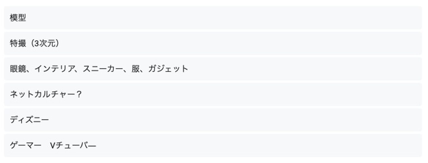 特撮やゲーマーなどの3次元から眼鏡、模型などなど、とても多種多様な回答になりました!