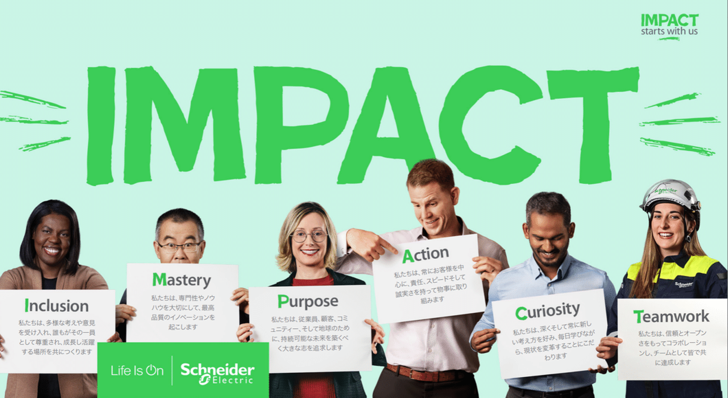 一番共感しており、また実行できているIMPACTバリューは"I" Inclusionです。そのほかのバリューも非常に重要なのですが、Inclusionは仕事をする上で基盤となると考えています。シュナイダーという会社の特徴として、非常に多様性が豊かです。また、仕事上、日本オフィス以外の方と関わる機会も多くあります。その中で、偏見を持ち接するとお互いいい気持ちはしません。相手が何を考えているのか、なぜそのように考えているのかを理解しようとし、どんな方ともフラットに接するようにすることで、仕事も効率よく進むのと思います。まだまだ、改善する箇所はありますが、今後もInclusion実行できるようにしていきたいです!
