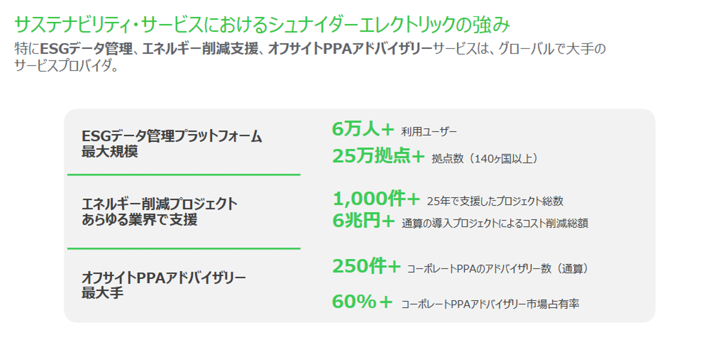 シュナイダーエレクトリックのサステナビリティ事業部は、持続可能な未来を目指す企業にとって、信頼できるパートナーです。デジタルと電化の融合、包括的なソリューション提供、そしてサプライチェーン全体での脱炭素化への取り組みが、他社との差別化要素となっています。