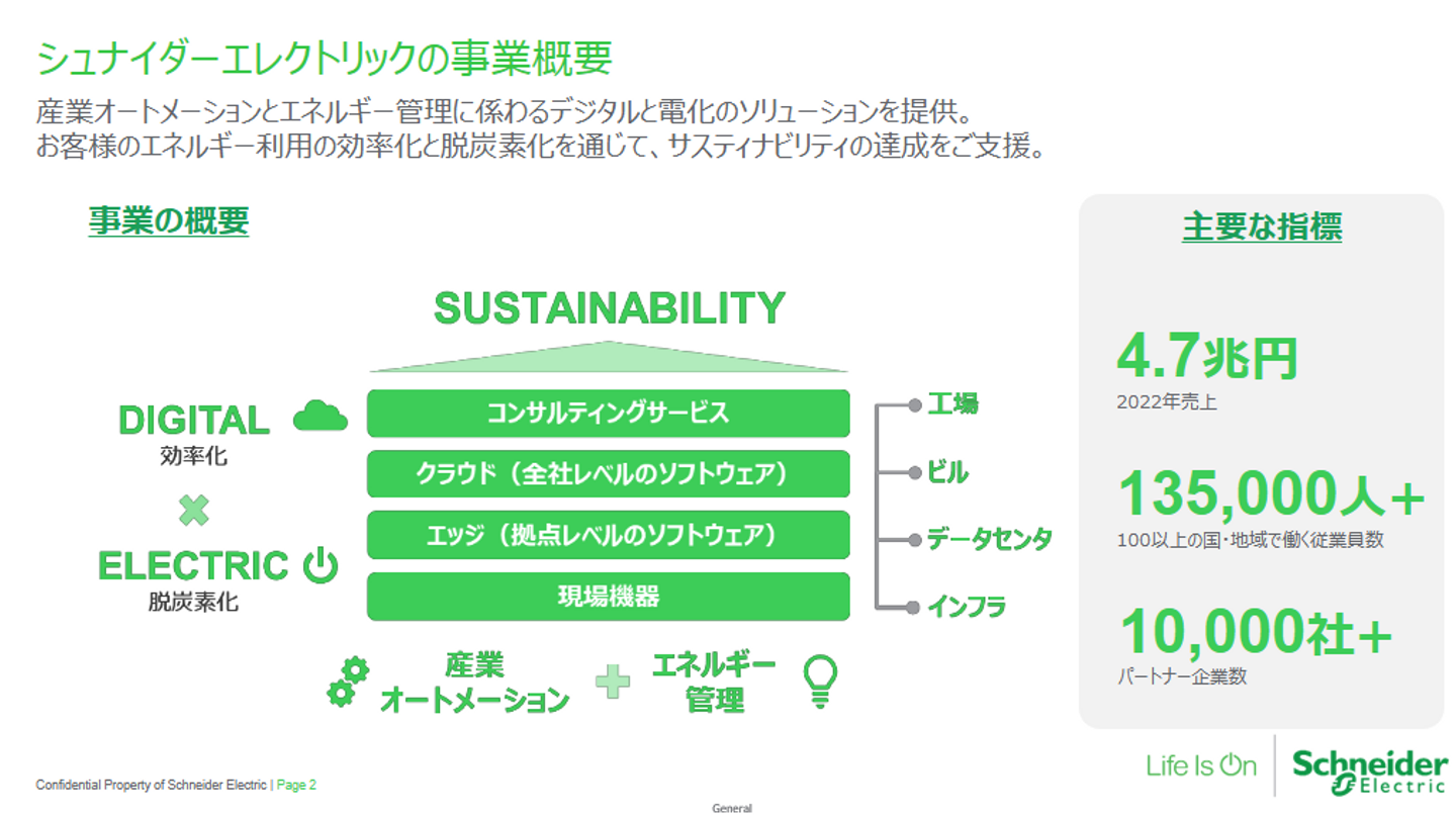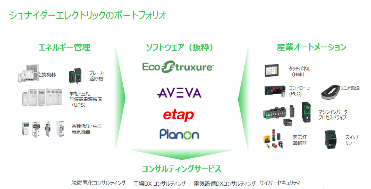 シュナイダーのメインビジネスの産業オートメーションとエネルギー管理を軸にお客様のサスティナビリティを実現するためデジタルソリューション・電気のソリューションをハードウェア・ソフトウェア・コンサルティングサービスを合わせて提供しているのが特徴です。シュナイダーが提供しているサービスは工場やビル、データセンターなどインフラもサポートしております。