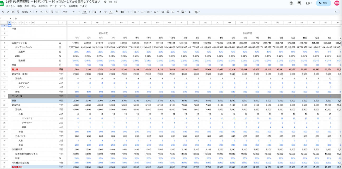 (実際に社内で使用しているPL予実管理シートと同様のテンプレートを使用しています。)