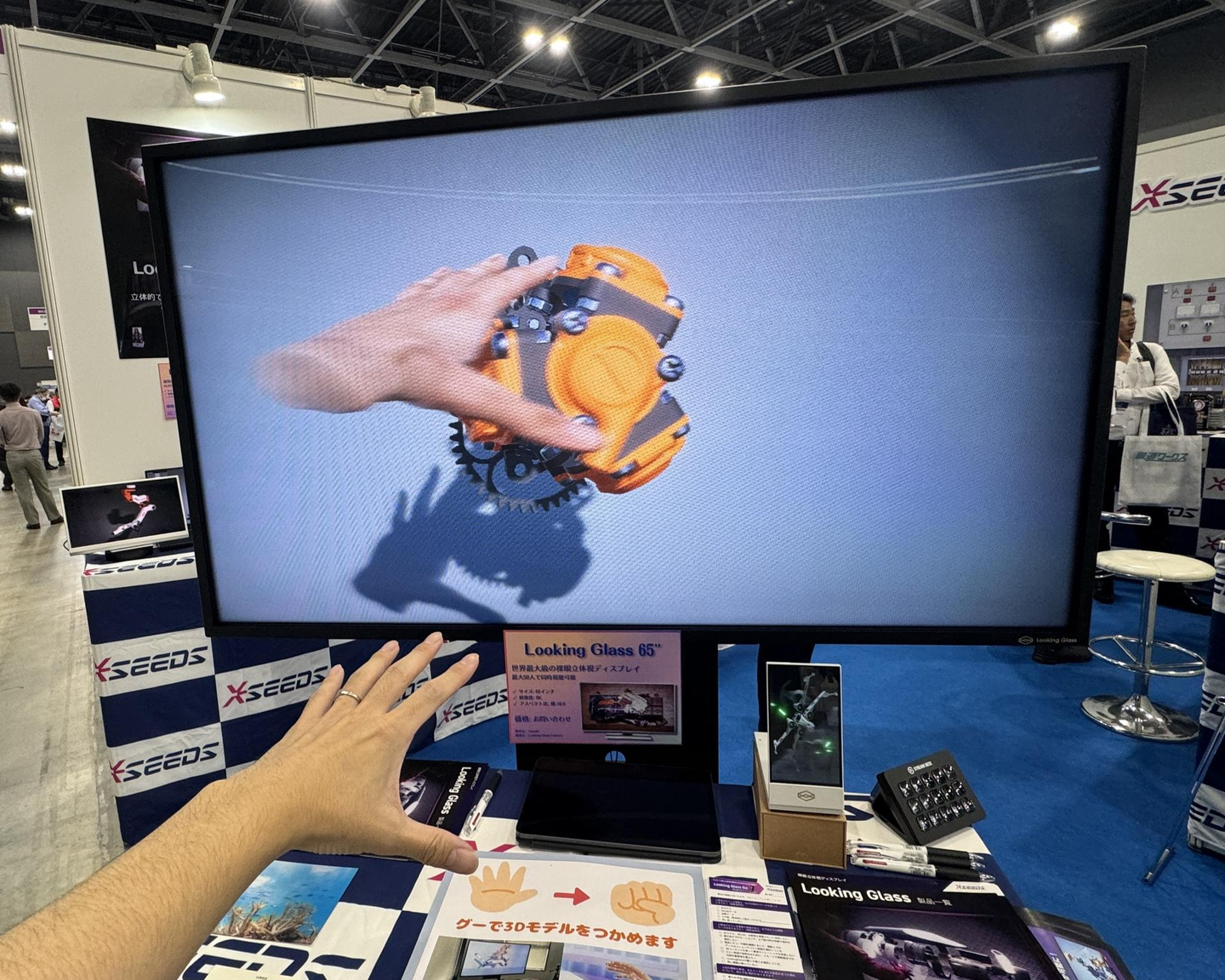 今回の目玉は、Looking Glass 65インチの世界最大級の裸眼立体視ディスプレイです。特別なメガネをかけなくても複数人同時に立体映像が見える、その没入感に多くの方が足を止めてくださいました。気づけば10人以上の人だかりができることも!