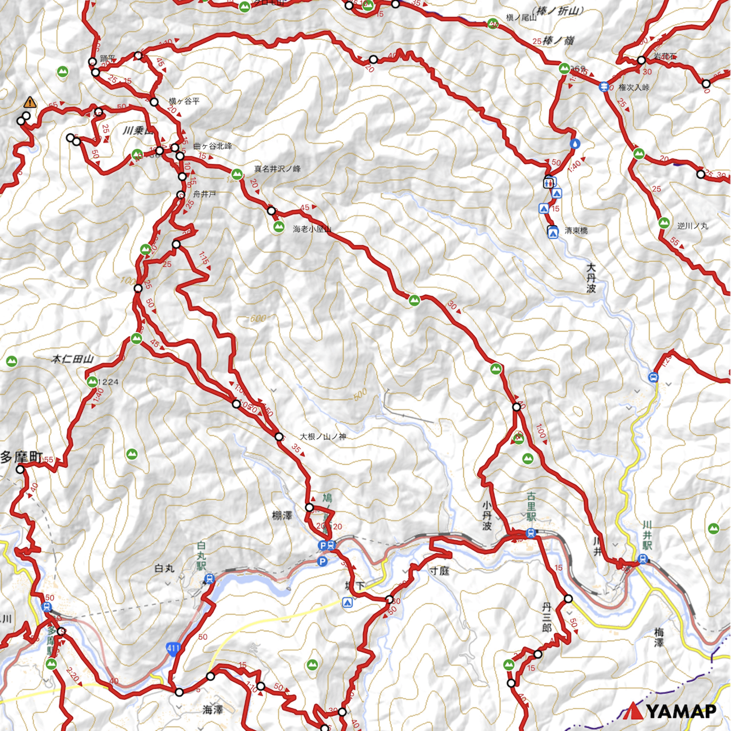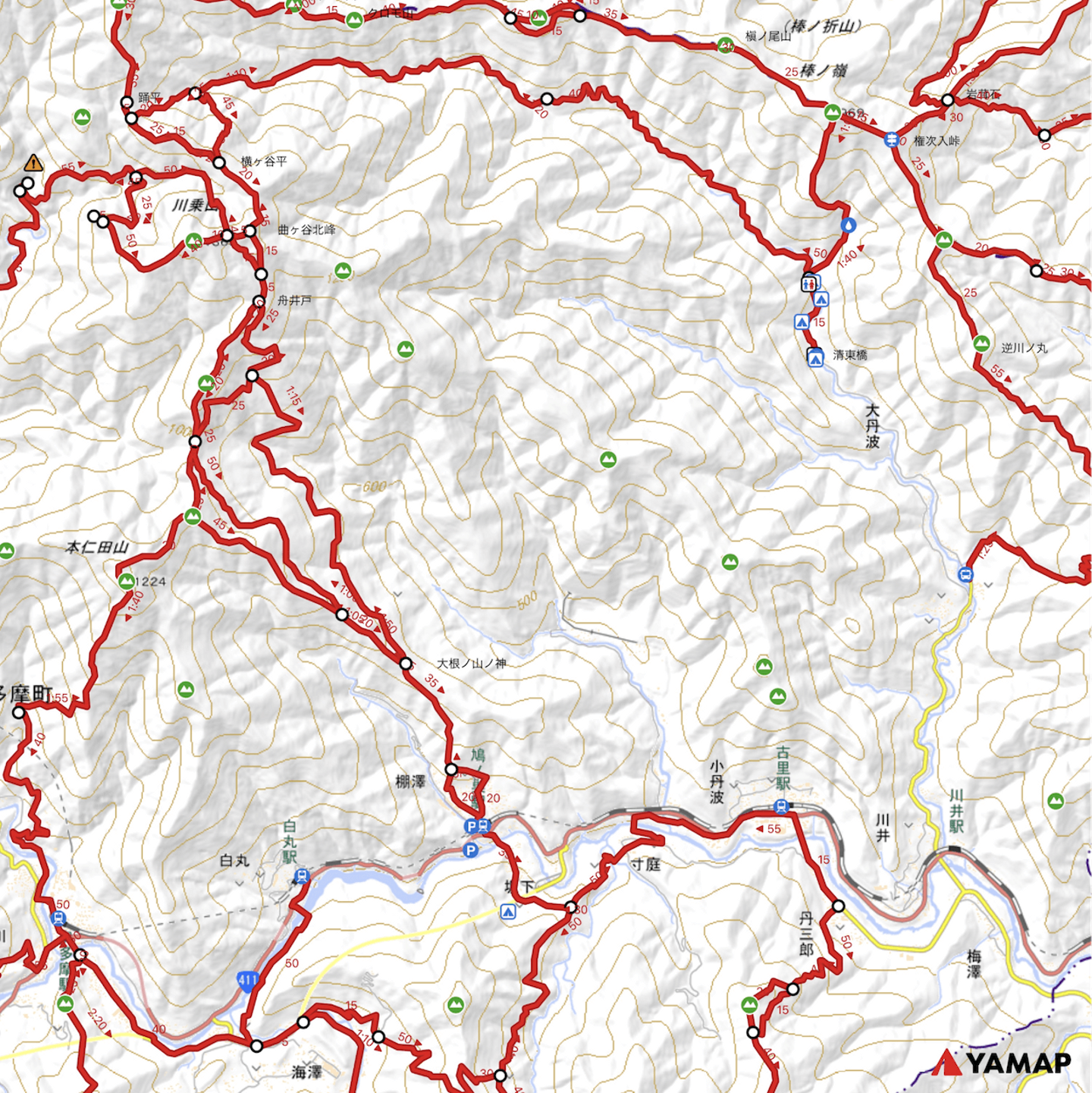 ルート追加前の地図(高水三山・岩茸石山)