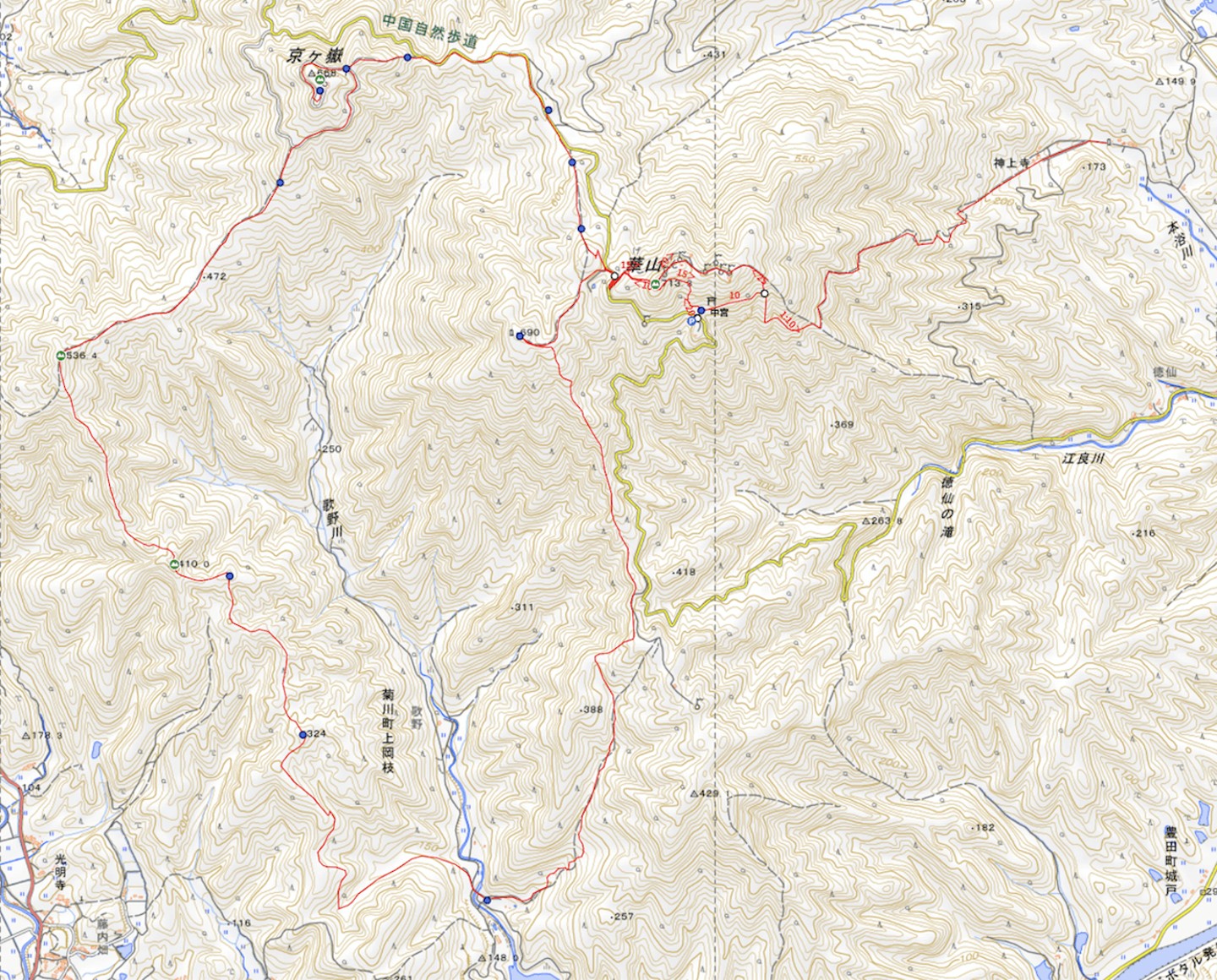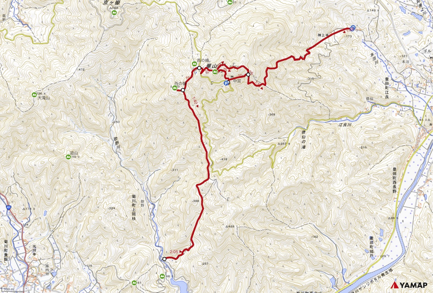 当初、このエリアのYAMAP地図に載っていたのは、神上寺登山口からスタートする最もメジャーなコースが1つだけ。僕の家は華山の南西側なので、このコースだと家から登山口までぐるっと移動する必要があり、やや行きにくい印象でした。