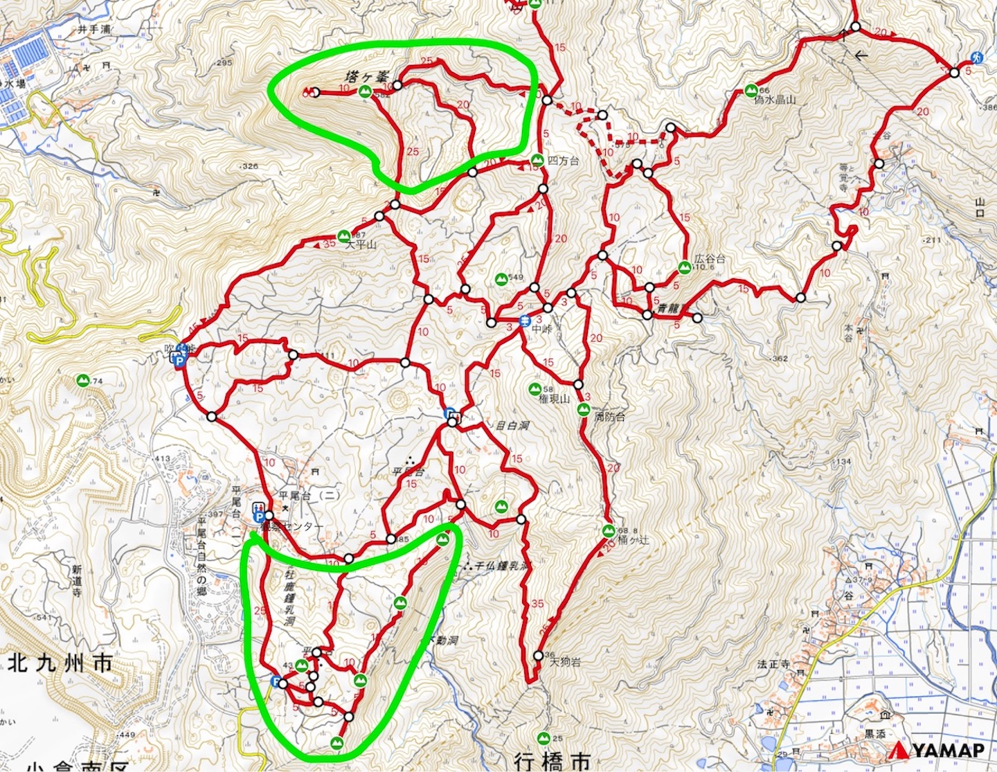 平尾台の地図(2020年8月20日時点)。緑色で囲った部分がデータから自動抽出された新ルート