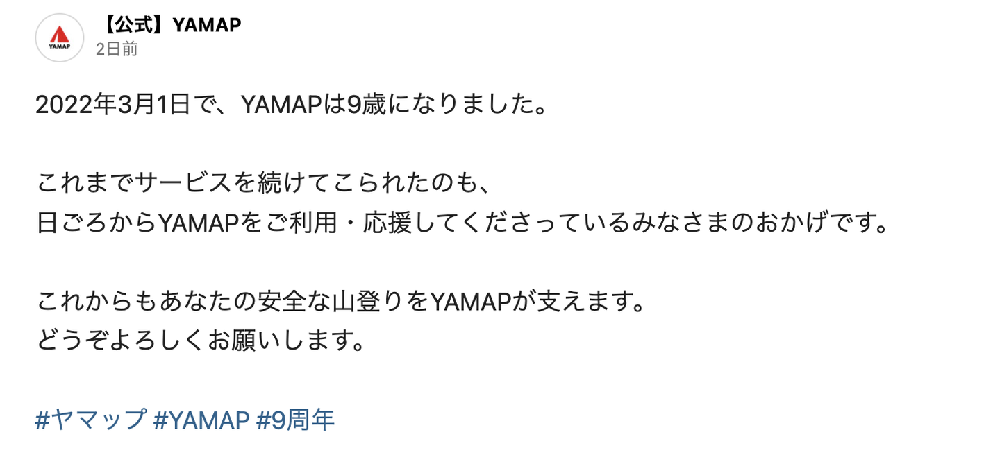 弊社が開発している登山サービスYAMAPが2022年3月1日で9歳になりました。つまり9周年ですね。