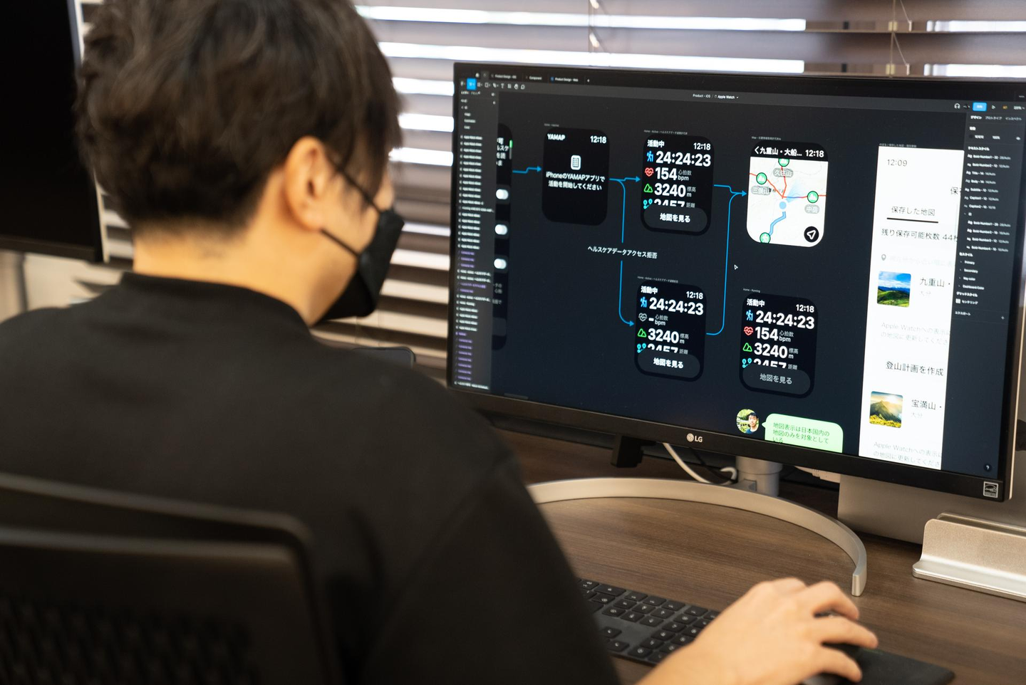 樋爪さんの主な仕事は、一般的にはUI/UXデザイナーといわれるもの。UIでは、人とデジタルを繋ぐ部分であるアプリの表層のデザインを行う。UXでは、登山者であるユーザーがやりたいことを達成するところまでをサポートする。これらは、ヤマップの事業の要である登山地図アプリに関わる仕事。しかしヤマップの手がける事業は、アプリの他にもYAMAP STOREでの登山用品の販売やYAMAP MAGAZINEでの情報発信、自治体や企業向けのサービスなど幅広い。