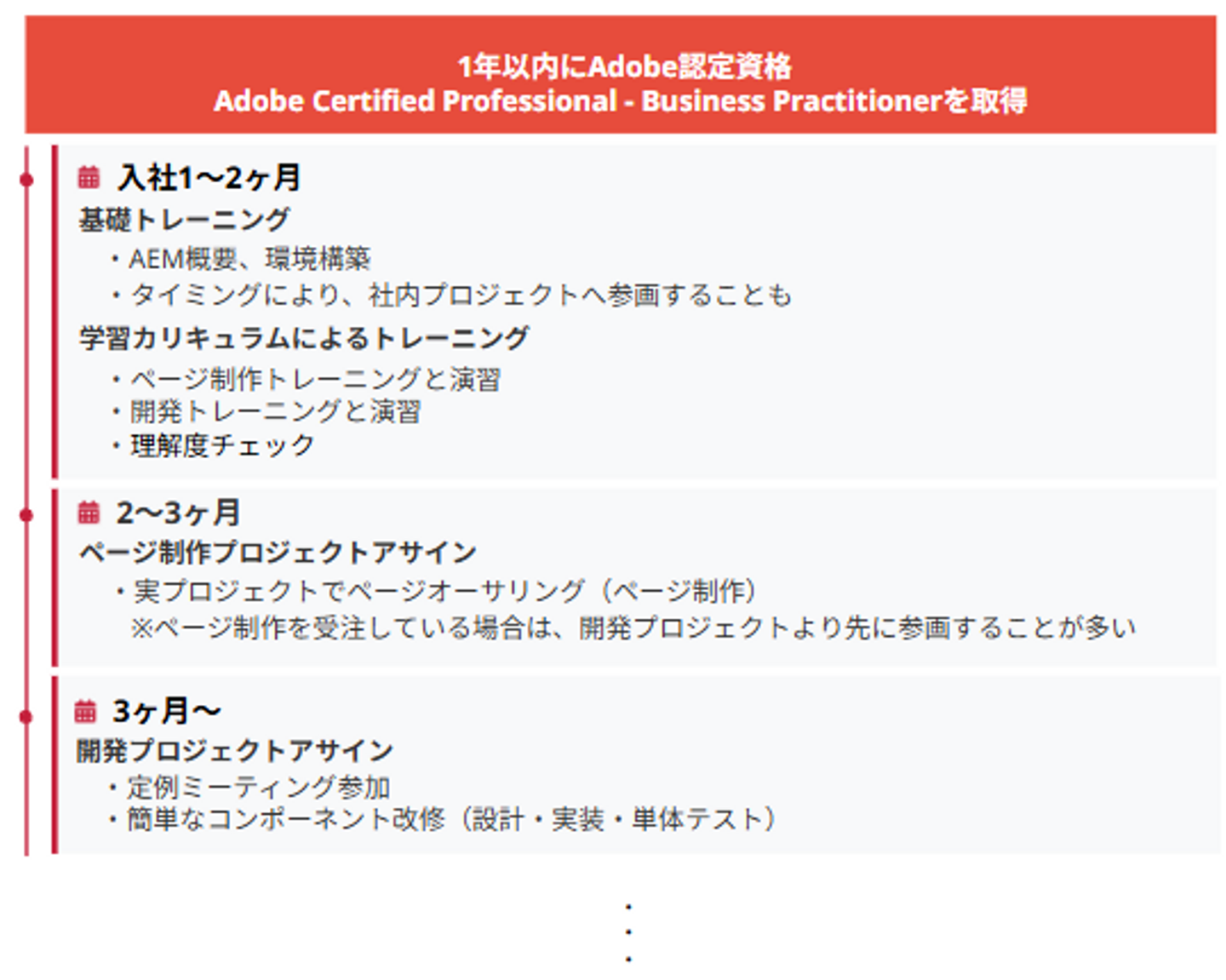 入社後はトレーニング期間を経て、スキルレベルにあったプロジェクトに参画いただきます。まずはできるところから始め、徐々に担当領域を広げていけるので安心です。