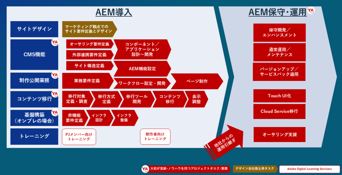 (※)Adobe Experience Maneger(AEM)とは、Adobe社が提供するWebコンテンツ管理システムです。AEMはコンテンツ管理システム(CMS)とデジタルアセット管理(DAM)が統合されており、Webコンテンツ全体の制作から公開を一元的に管理することが可能な製品です。