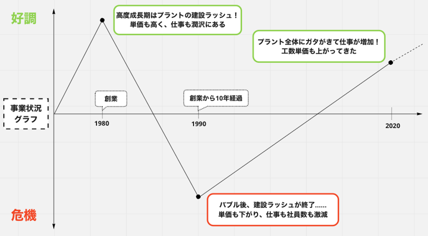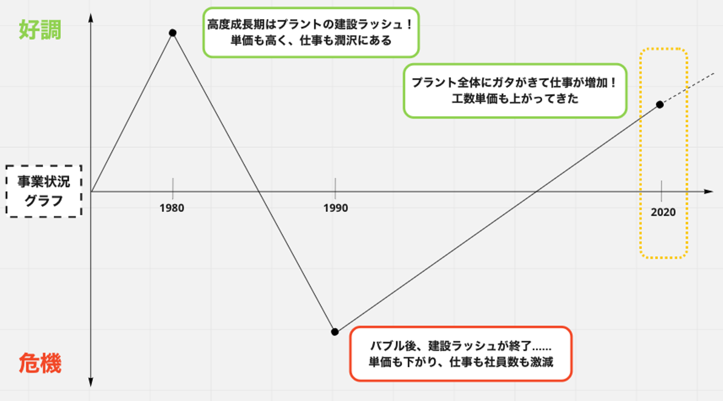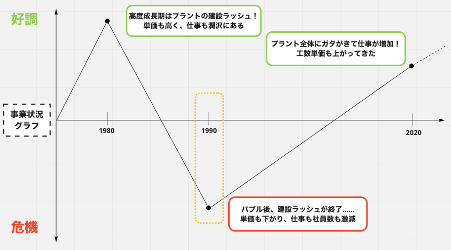 バブルが弾けた後から、プラント業界は人材不足に見舞われます。職人はもちろんですが経営者もぐっと減りました。