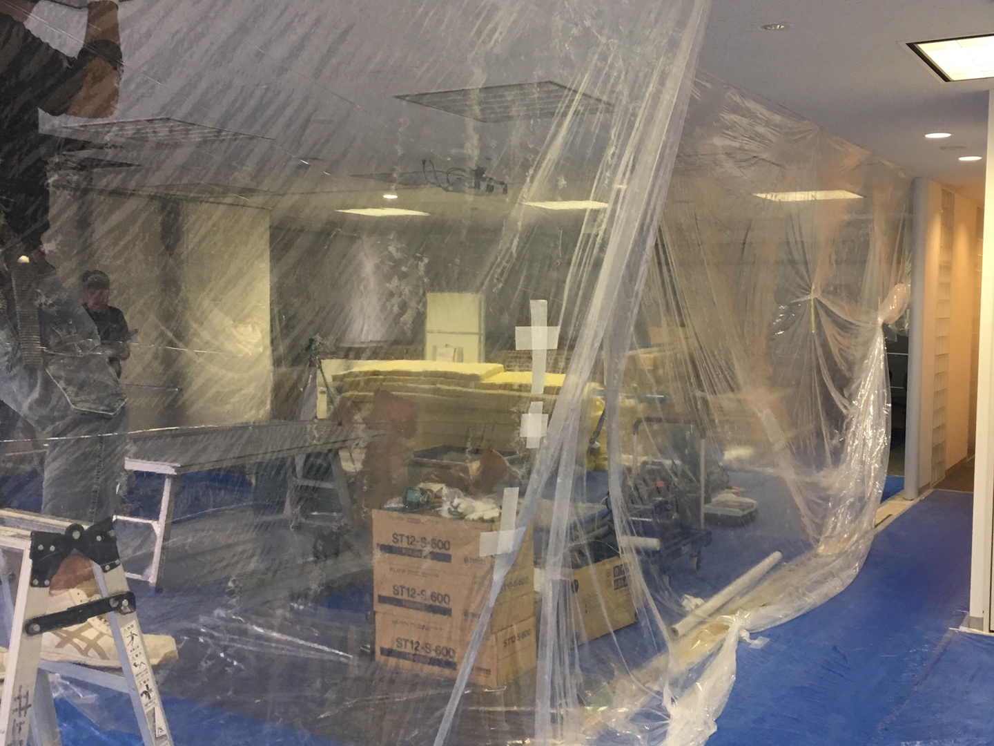 本日はビフォーアフターの1つをご紹介いたしますね。 こちらはリノベーション期間中ビニールで覆われていた6階のスペース。もともとは2つの会議室がありました。