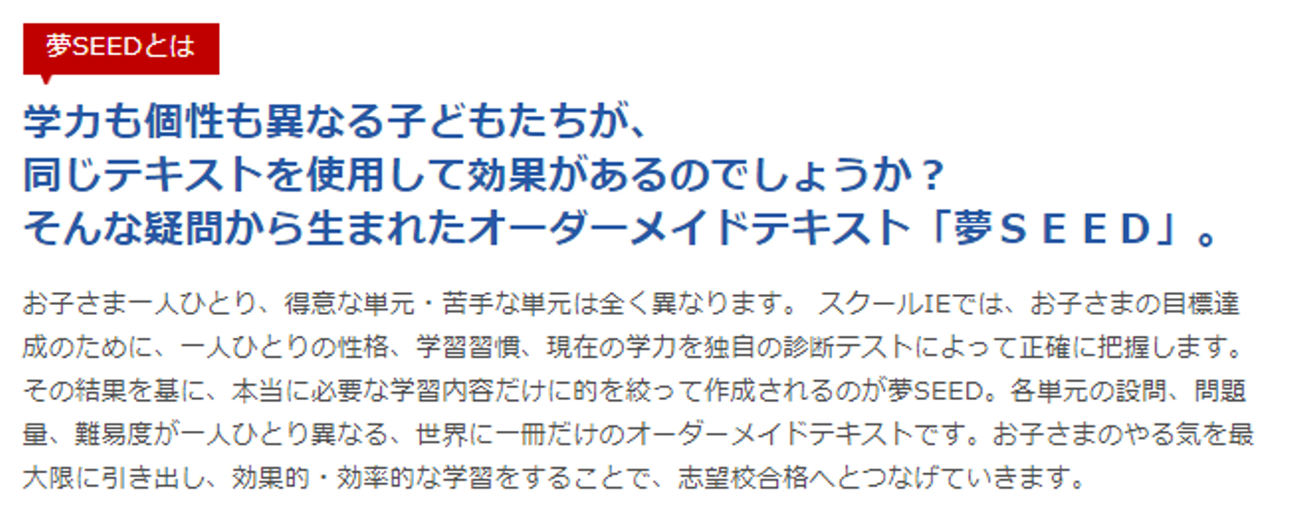学力診断テストの「PCS」にもとづいて一人ひとりに合ったオーダーメイドテキストの「夢SEED」を作成し、スクールIEの講師を派遣しています。1:1あるいは1:2の個別指導ではなく、5名1グループの小集団を先生が巡回しながら指導し、個別の課題解決を行うハイブリッド授業を展開しています。