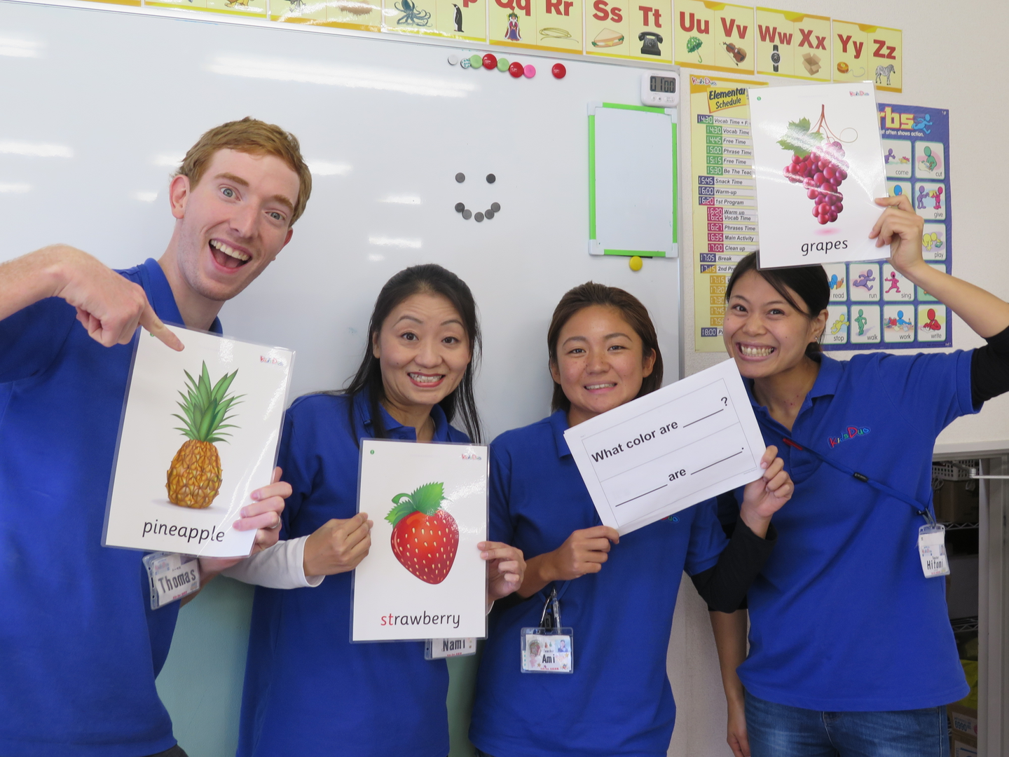 例) 「はい、次はパイナップル。」「P・i・n・e・a・p・p・l・e。黄色いフルーツです。」みたいなやり取りです。