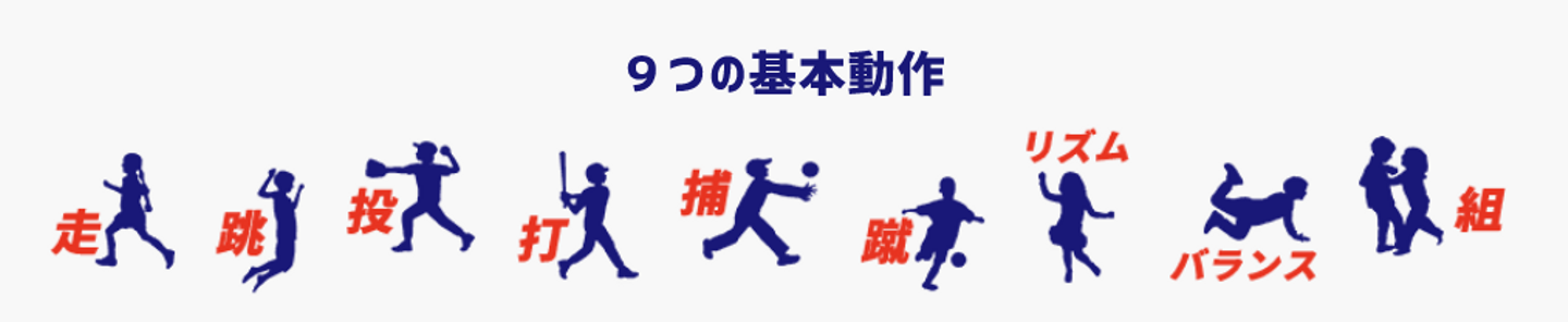 「走る・跳ぶ・投げる・捕る・蹴る・打つ・組む・バランス・リズム」