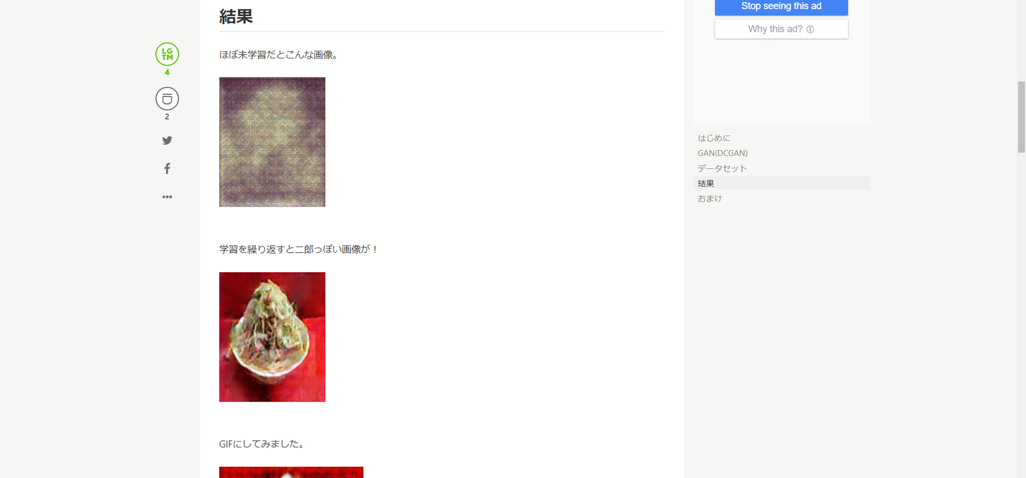 例えば、海外のセレブの顔を学習させて存在しないセレブの顔を作るというものです。すごくくだらないのですが、私はラーメン二郎の画像を学習させて存在しないラーメン二郎の画像を作っていました(笑)。