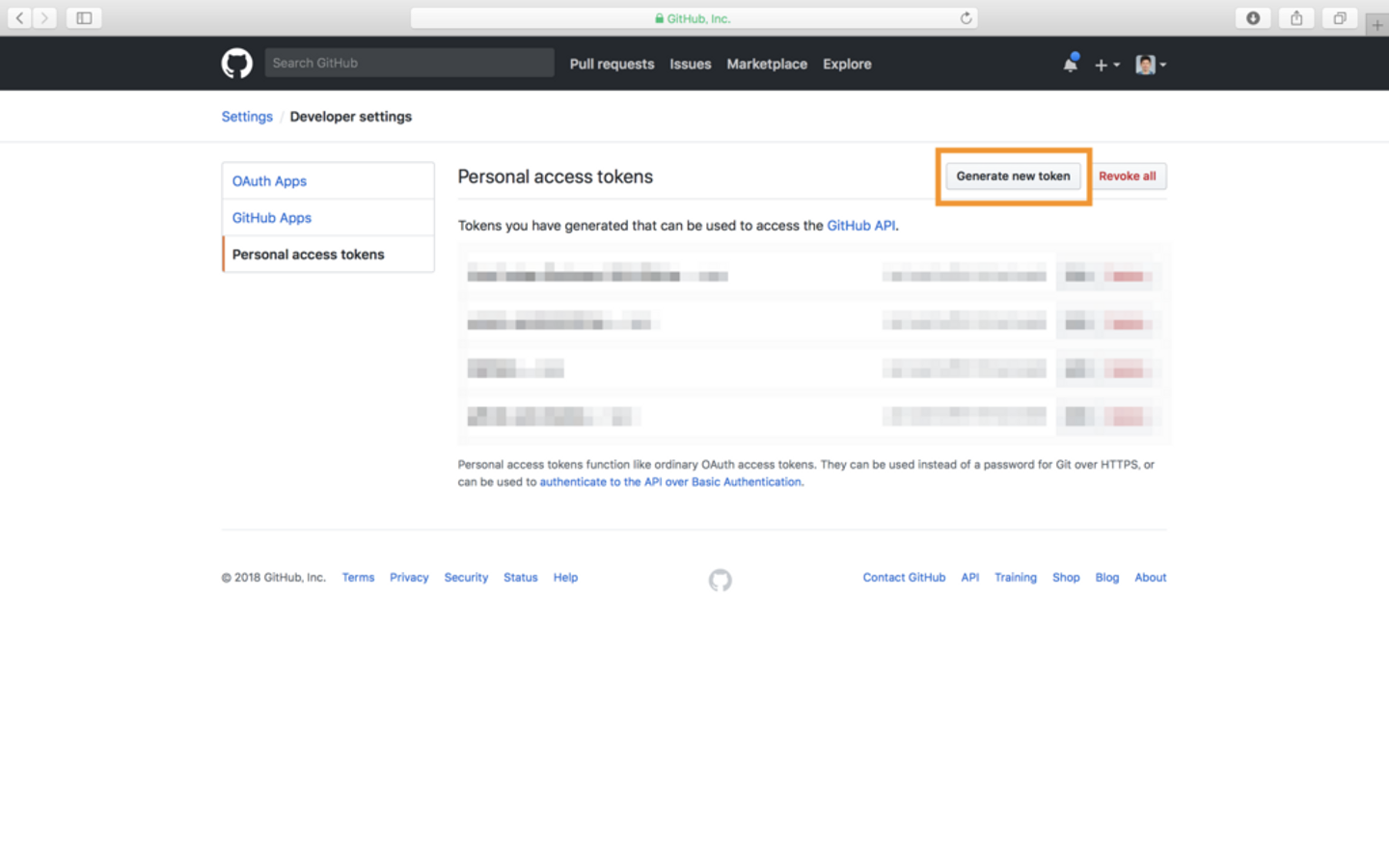 3. Generate Token をクリックすると、 Personal access tokens が発行されるため、手元に残しておく(後ほど利用するため)