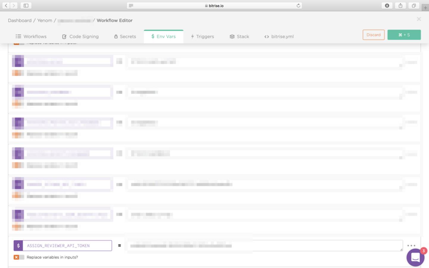Workflow Editor > Env Vars に先ほどのアクセストークンを ASSIGN_REVIEWER_API_TOKEN のkeyで追加する。