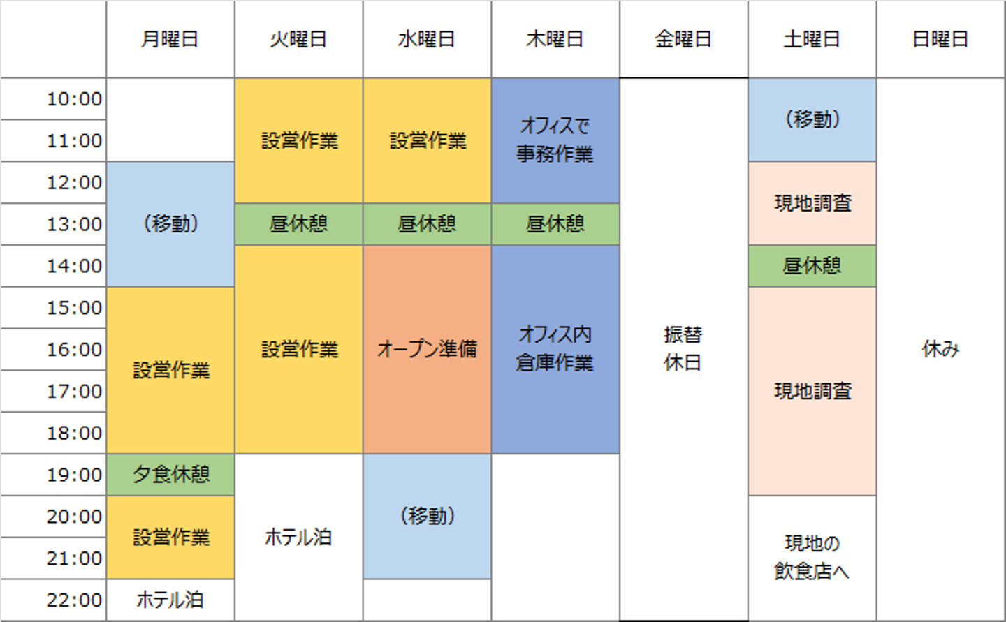 こちらは店舗開発セクションに所属する1年目のメンバーのスケジュールを参考に再現した、1週間の仕事の流れです。